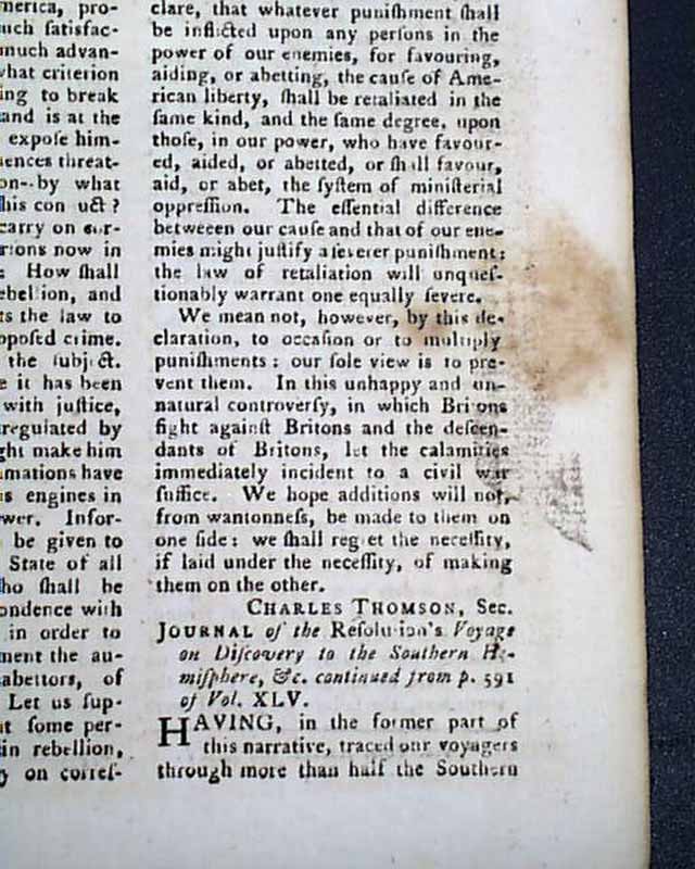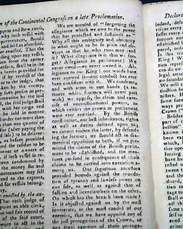 There is some great text including: "We the delegates of the 13 United Colonies...have taken into our most serious consideration a proclamation issued from the court of St. James's on the 23d day of August...We are accused of 'forgetting the allegiance which we owe to the power that has protected & sustained us'...What allegiance is it that we forget? Allegiance to parliament! We never owed--we never owned it. Allegiance to our King! our words have ever avowed it...We condemn & with arms in our hands...we oppose the claim & exercise of unconstitutional powers to which neither the crown or parliament were ever entitled..." with much more.
