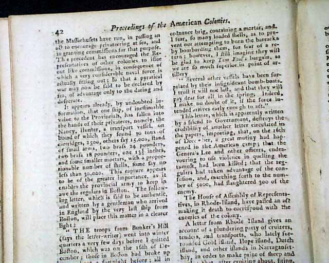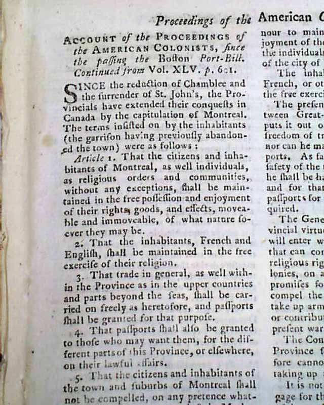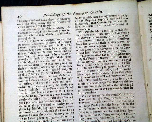 Over 4 pages are taken up with an: "Account of the Proceedings of the American Colonists since the Passing the Boston Port Bill" which is continued from an earlier issue. This report has much on the Revolutionary War and includes the very significant proclamation from Lord Dunmore of Virginia in which he allowed Negroes to serve in his army.