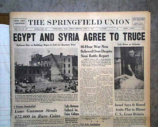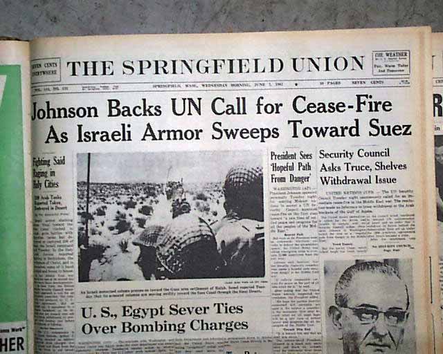 THE SPRINGFIELD DAILY REPUBLICAN, Springfield, Massachusetts, dated June 6, 1967, June 7, 1967, and June 9, 1967 (a three issue set).  This is a great trio of issues which includes the first report (with a map and image), a second issue (with a full banner heading), and a third issue containing the peace agreement announcement - all related to the Six Day War between Israel and Syria.