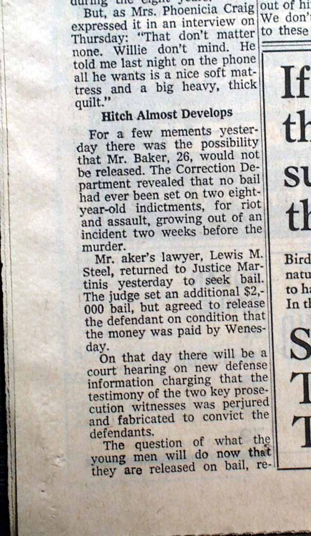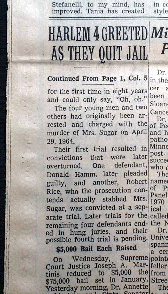 The front page has the heading: "Crowd Greets Harlem 4, Out of Jail After 8 Years", followed by text which continues on an inside page. This tells of the release of four of the "Harlem Six", all of whom were initially convicted for the murder of Margit Sugar - all of which flowed from an initial incident referred to as "The Little Fruit Stand Riot".
