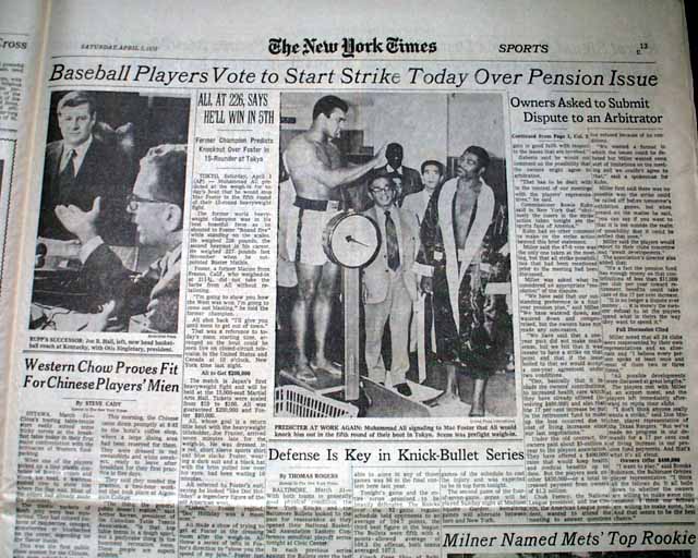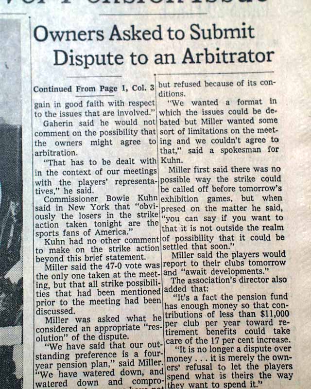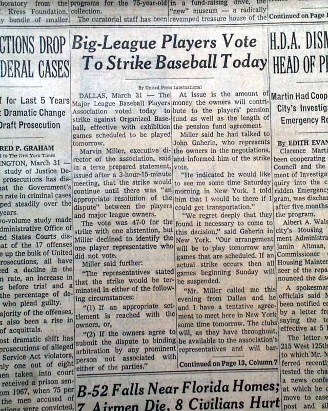 Also on the front page is a two column heading: "Big-League Players Vote To Strike Baseball Today". The sport's section (page 13) has a banner headline: "Baseball Players Vote to Start Strike Today Over Pension Issue", with a supporting photo. This is 1st report coverage on the first players' strike in Major League Baseball history.