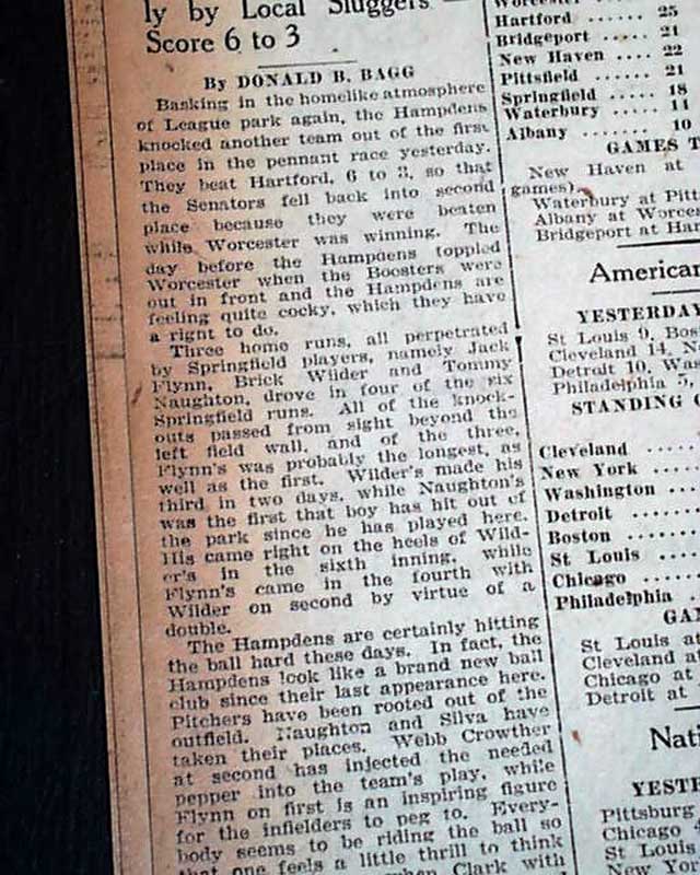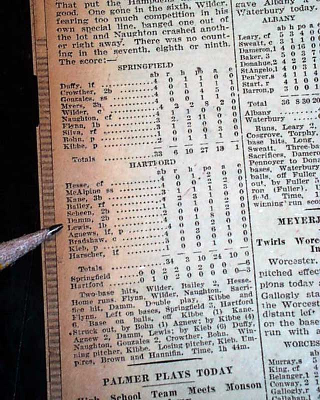 Note the report headed: "Hampdens' Home Runs Knock Hartford Out" on the game between the Hartford Senators and the Springfield team. Note the box score which lists "Lewis" as the first baseman. "Lewis" is also mentioned in the article.