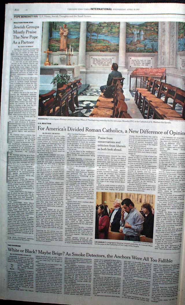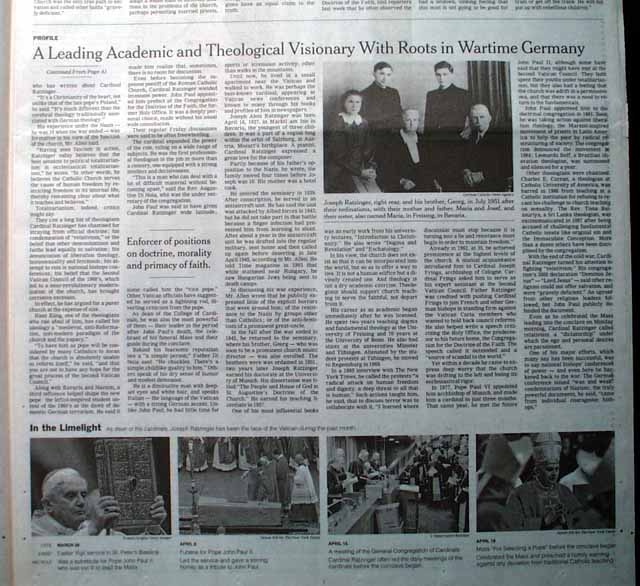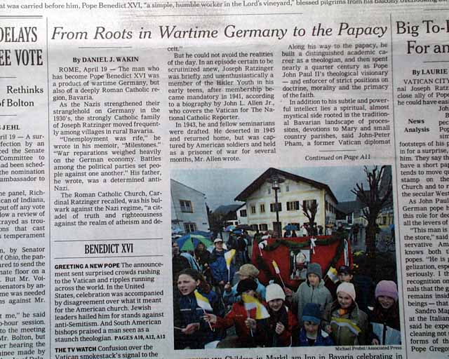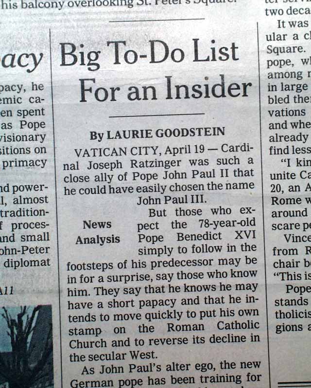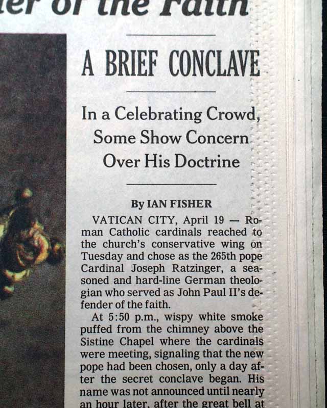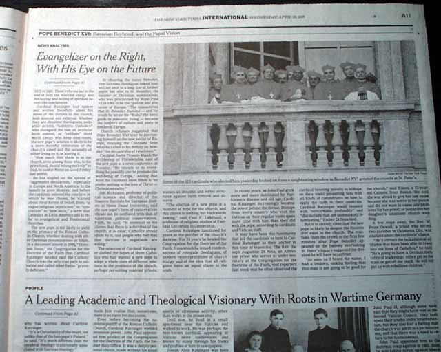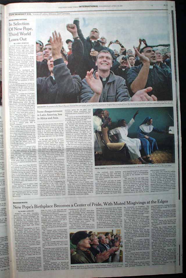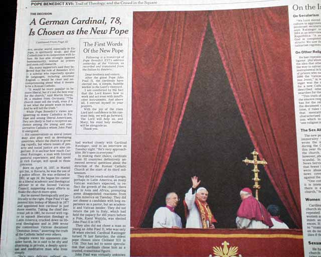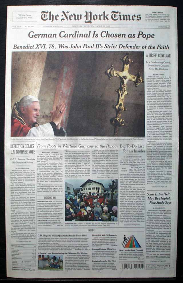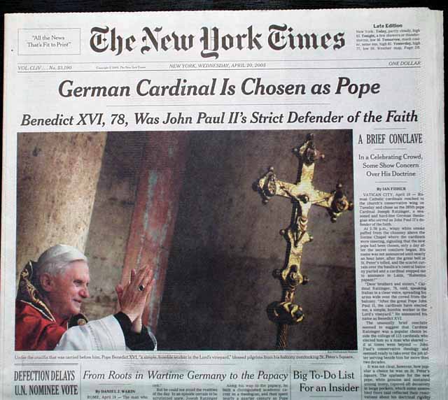 THE NEW YORK TIMES, April 20, 2005 The front page has the 2-line banner heading: "German Cardinal Is Chosen as Pope - Benedict XVI, 78, Was John Paul II's Strict Defender of the Faith", with multiple corresponding articles and photos. Several inside pages are dedicated to the selection of the Roman Catholic Church's 265th Pope. See images for details. Nice to have this coverage in such a prominent newspaper.
