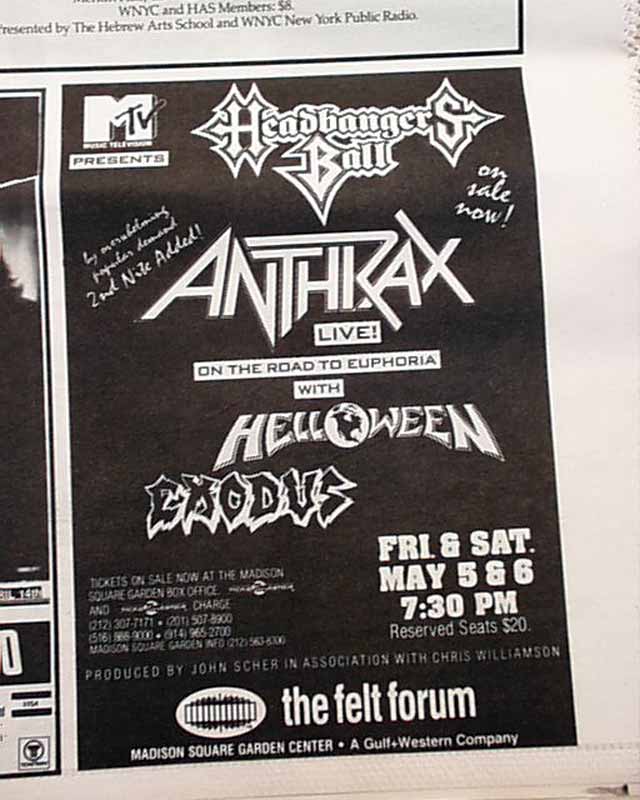 AI notes: On May 5 and 6, 1989, the Felt Forum at Madison Square Garden in New York City hosted a legendary pair of concerts linked to MTV’s Headbangers Ball, the definitive heavy metal TV show of the late ‘80s. These shows captured the raw energy and rebellious spirit of the metal scene at its peak, featuring some of the era’s most influential bands delivering electrifying live performances. The Felt Forum, an intimate venue within the larger Madison Square Garden complex, provided the perfect setting for fans to experience the thunderous sound and intense atmosphere up close. This event was a snapshot of metal culture during a time when thrash, glam, and traditional heavy metal were all thriving, and it helped solidify Headbangers Ball as a crucial platform for both established and rising metal acts. The concerts remain iconic among metal enthusiasts for their authenticity and the sense of community they fostered among fans and musicians alike.