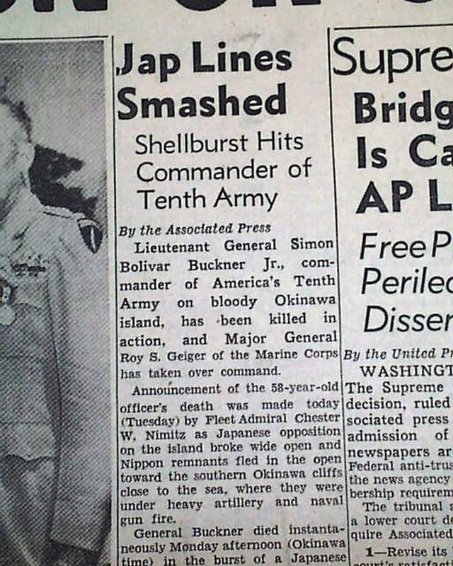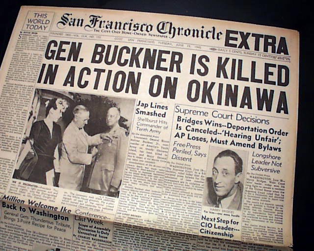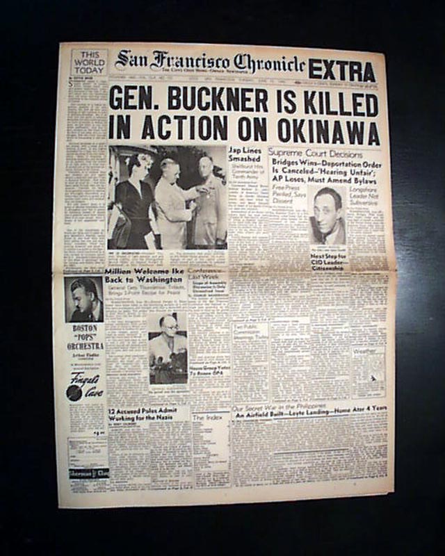 SAN FRANCISCO CHRONICLE--EXTRA, June 19, 1945  The bold front page headline announces: "GEN. BUCKNER IS KILLED IN ACTION ON OKINAWA".