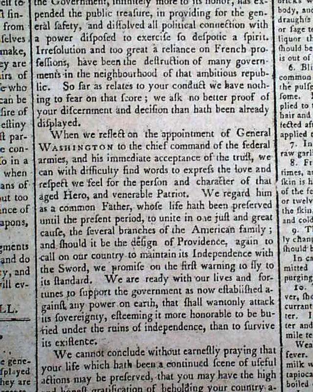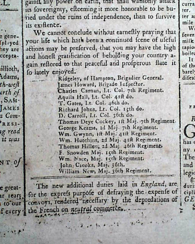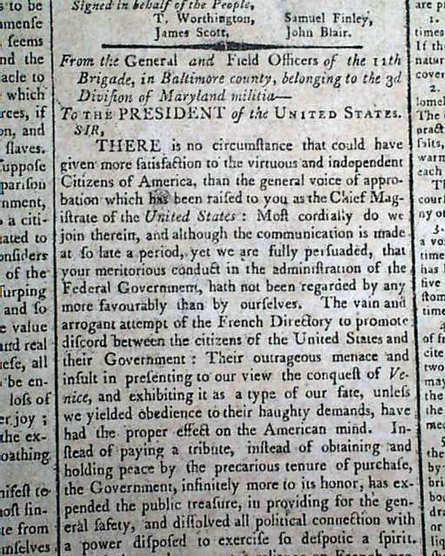 Page 2 has an address: "To the President of the United States" from military officers of Baltimore County, relating to the growing tensions with France. One bit notes: "...When we reflect on the appointment of General Washington to the chief command of the federal armies, & his immediate acceptance of the trust, we can with difficulty find words to express the love & respect we feel for the person & character of that aged Hero and venerable Patriot..." with more glowing comments.
