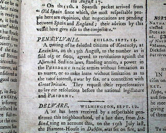 Page 3 has under "Pennsylvania": "A meeting of the deluded citizens of Kentucky, at Lexington...to the number...of 5 or 6000, agreed to revolutions against the Alien and Sedition laws...They request their representatives to lay the resolutions before the national legislature and President."