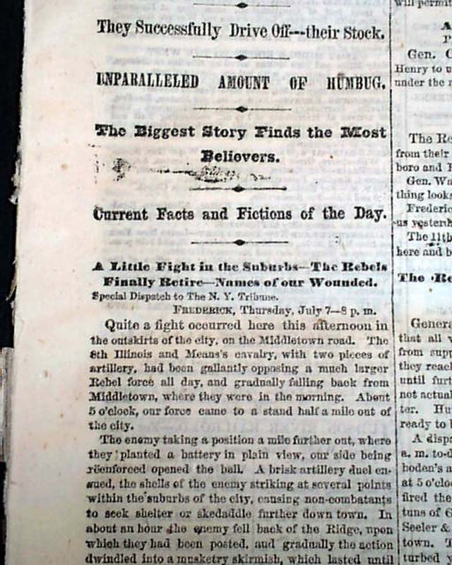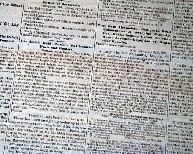 Among the first column headings on the Civil War are: "The Great Rebel Invasion", "Everything as Clear as Mud", "Nobody Hurt--Everybody Scared", "A Few Small Skirmishes", "Two States Quaking Before a Band of Horse-Thieves", " and more. The articles include: "The Rebels at Hagerstown - Railroad Property Destroyed", "The Rebel Raid Further Particulars - Facts and Rumors", which includes details of events in and around Hagerstown and Frederick, and more.