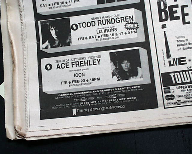 Page 82 has a 4 1/2 x 4 3/4 inch advertisement for a upcoming "ACE FREHLEY" performance at the RITZ nightclub in Manhattan. (see images)