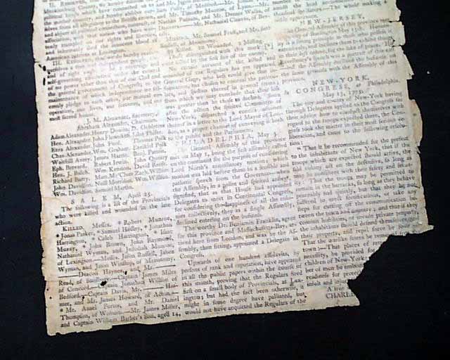 "...What purported to be an issue of this paper of June 3, 1775 was exploited in Collier's of July 1, 1905 by S. Millington Miller, who claimed that he owned the original. The reproduction printed in Collier's shows only the heading and part of the first and second columns...The paper was immediately believed to be fraudulent & in the 'American Historical Review'...A. S. Salley and Worthington C. Ford showed the paper to be a forgery with the heading based upon an original issue of Nov. 24, 1769 owned by the American Antiquarian Society. The same defects in type, and even fly-specks in the 1769 issue appear in the spurious 1775 heading.