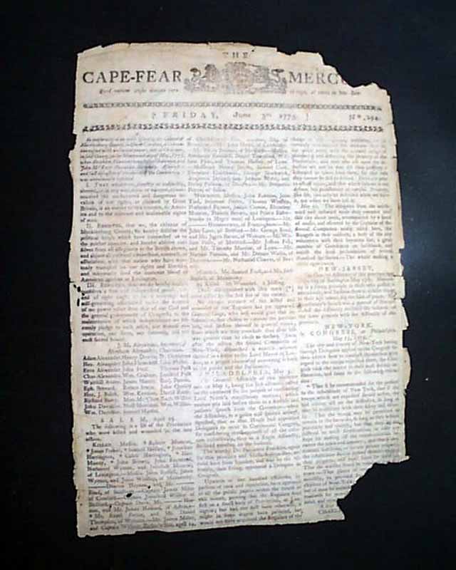 THE CAPE-FEAR MERCURY, Wilmington, North Carolina, June 3, 1775 This would have to be one of the more interesting colonial newspapers we've offered, primarily for being a forgery.