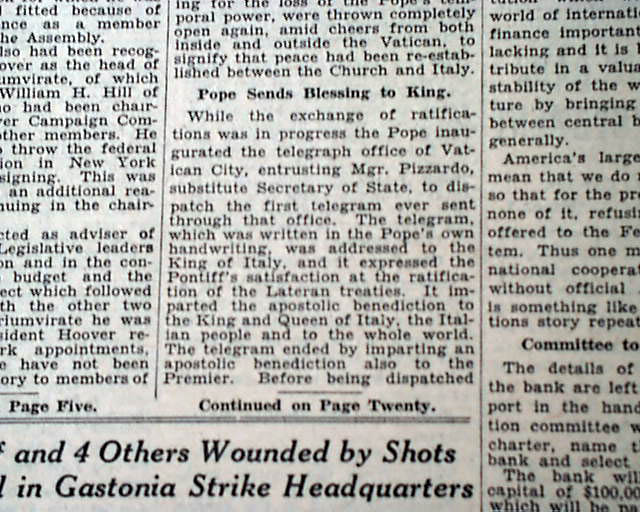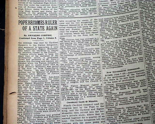 The front page has a one column heading: "POPE BECOMES RULER OF A STATE AGAIN" with subheads. (see) First report coverage on the creation of the state of the Vatican City which guaranteed full and independent sovereignty.