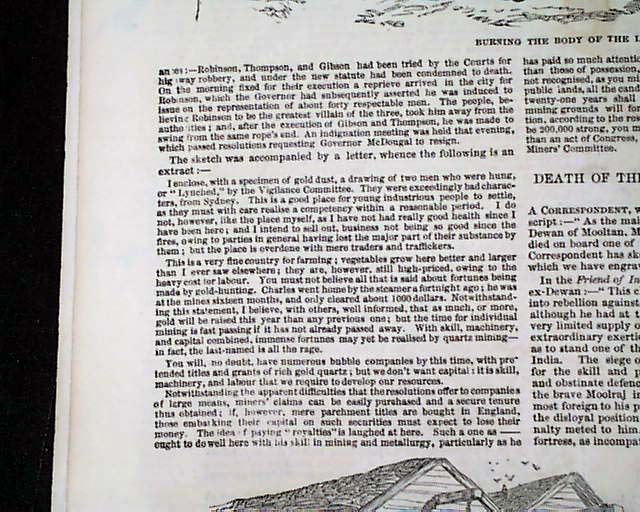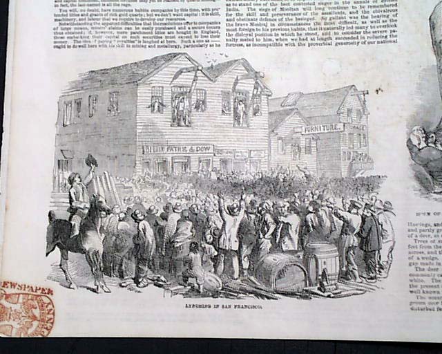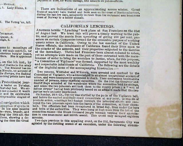 ILLUSTRATED LONDON NEWS, England, Nov. 15, 1851  Pages 3 and 4 contain an article on a famous case involving the San Francisco Committee of Vigilance, headed: "Californian Lynchings". Included as well is a print captioned: "Lynching In San Francisco".
