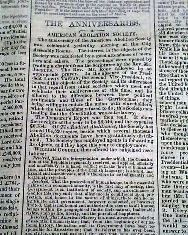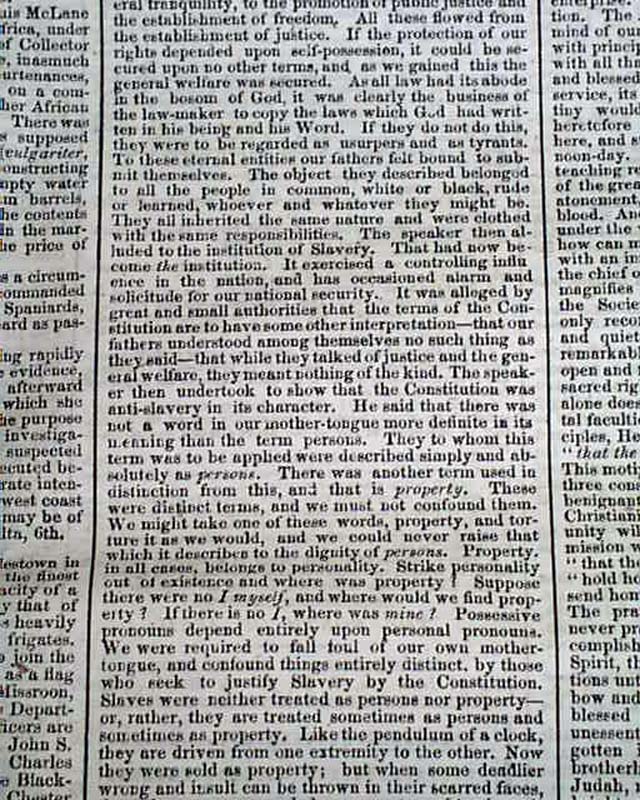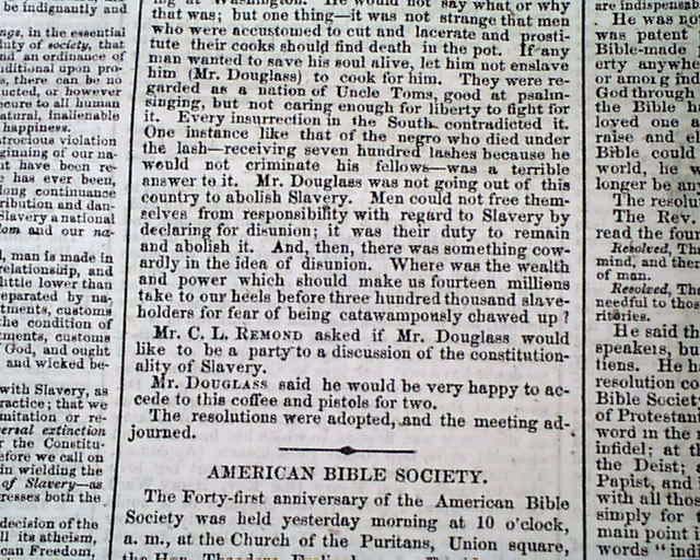 Some bits include: "Frederick Douglass then came forward and was perceived with loud and continued applause...He was for the abolition of slavery--whether with or without the Constitution...He was aware that the cause was beset with dangers & difficulties on every hand. The slave power was never perhaps better organized or more determined than at the present time...Every time that white men looked at colored men, they could not regard them as chattels. The Supreme Court of the United States was great, but the Supreme Court of God Almighty was greater...He hoped the time would come when the colored man should be proud of his color and his form..." and much more.
