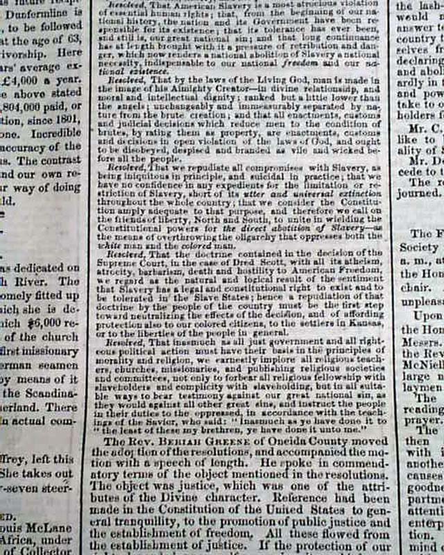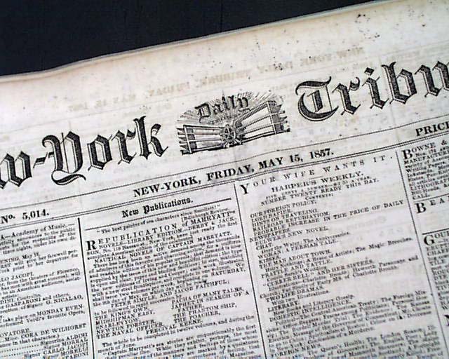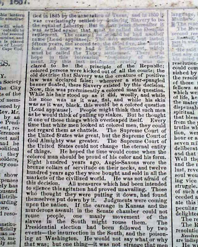 NEW YORK DAILY TRIBUNE, May 15, 1857 Page 6 has over a column taken up with a report headed: "American Abolition Society", the latter portion of which has a report of Frederick Douglass taking the podium. This report concerns his Dred Scott speech of the day prior, and was formally called "Colored Men's Rights in This Republic". Portions are alluded to in his talk, as the famous speech was quite lengthy.