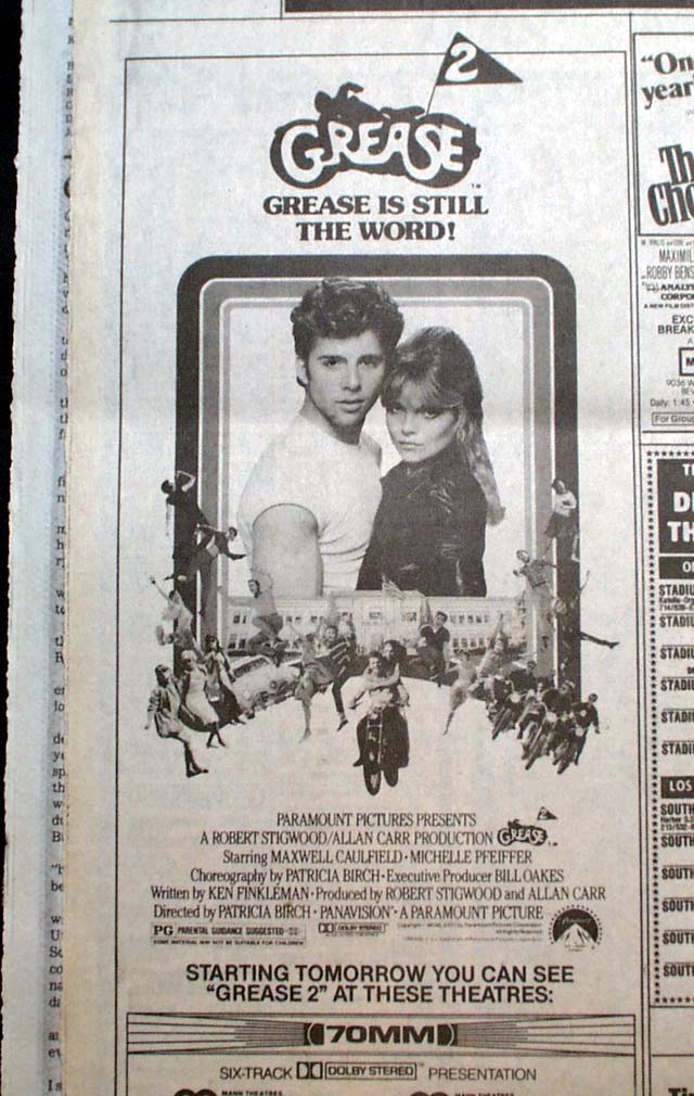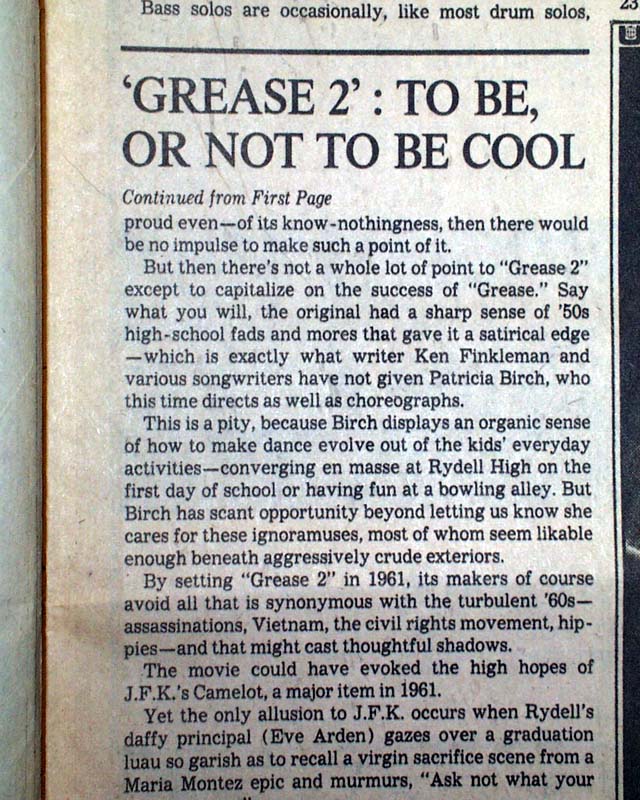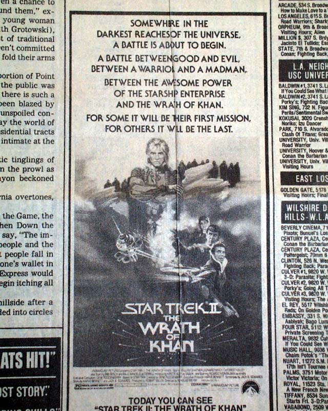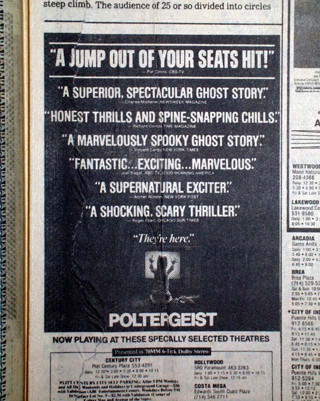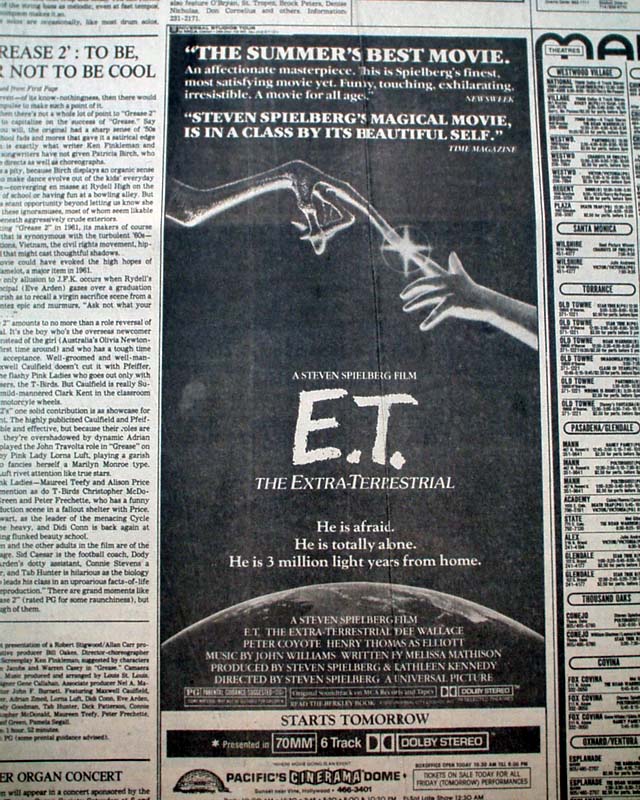 A terrific issue on the premiere of both E.T. the Extra Terrestrial & Grease II, with the latter also including a review which includes a photo. Both ads include: "start tomorrow"). Other ads include those for movies released the prior weekend: Poltergeist, Star Trek: The Wrath of Khan, and Hanky Panky. Great to have in a Los Angeles newspaper with its proximity to Hollywood.