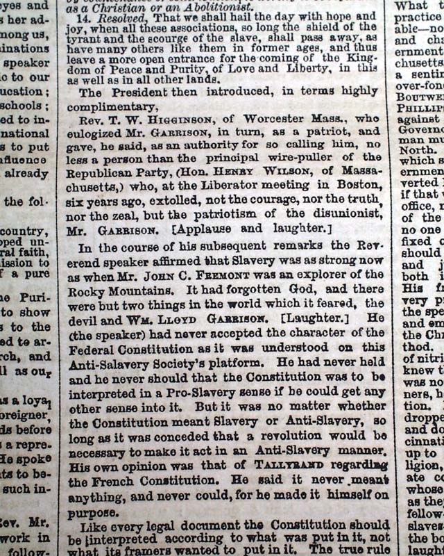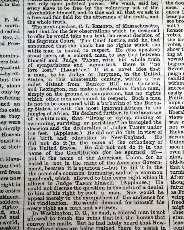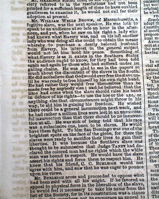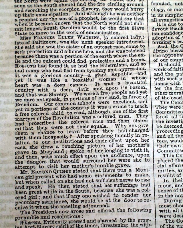 the semi-weekly times, New York, May 15, 1857 Pages 2 and 3 have significant coverage of the 24th anniversary gathering of the American Anti-Slavery Society. Among the speakers were William Lloyd Garrison (President), Wendell Phillips, Frances Ellen Watkins (a free negro woman), William Wells Brown (a fugitive slave), and more. While most are familiar with the first two mentioned above, the latter two are worth exploring.
