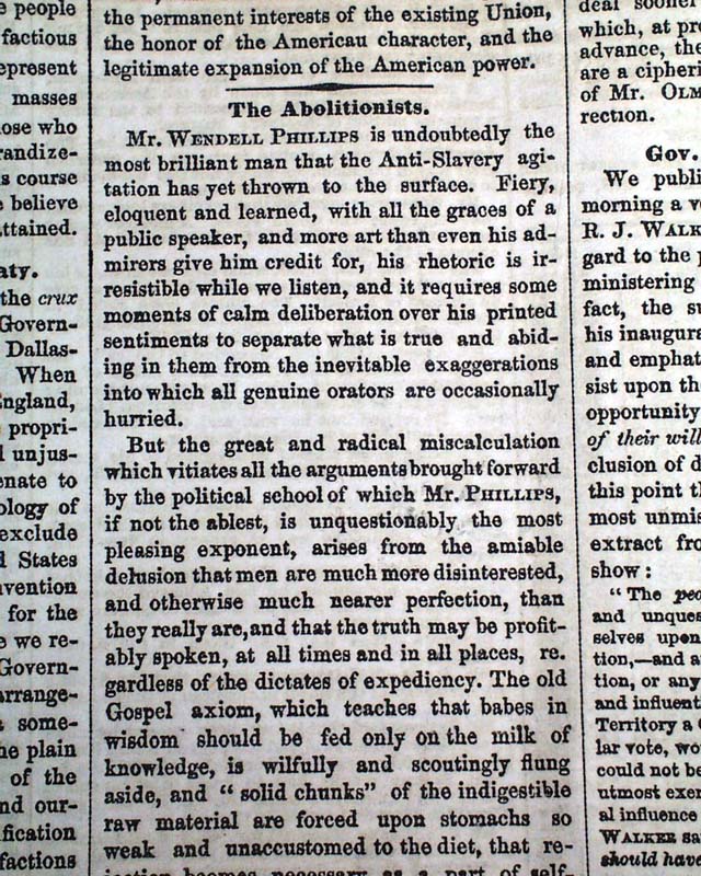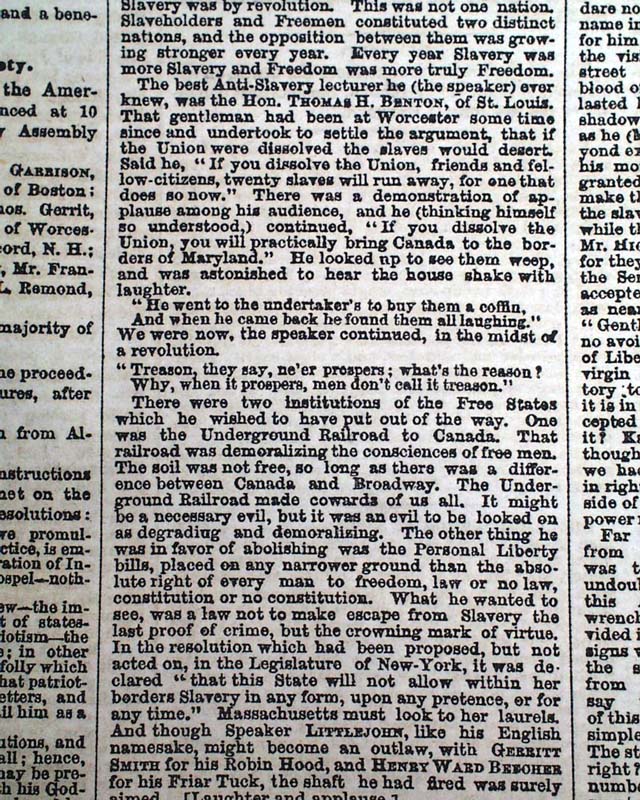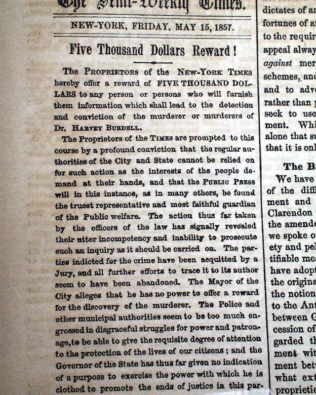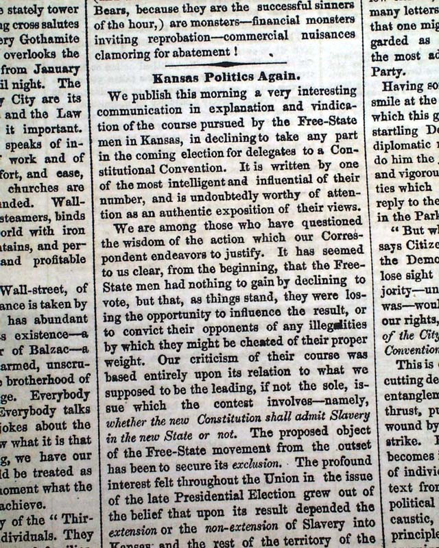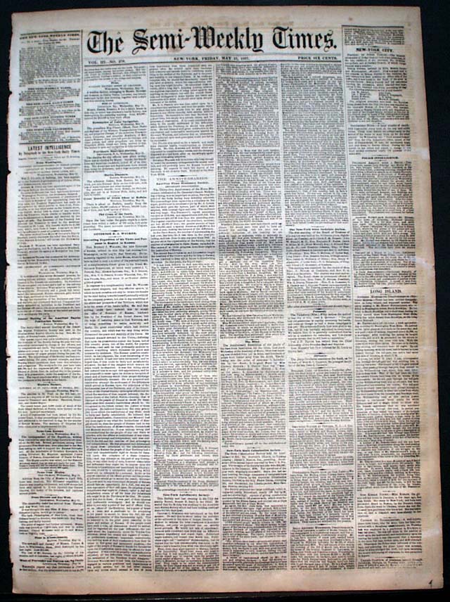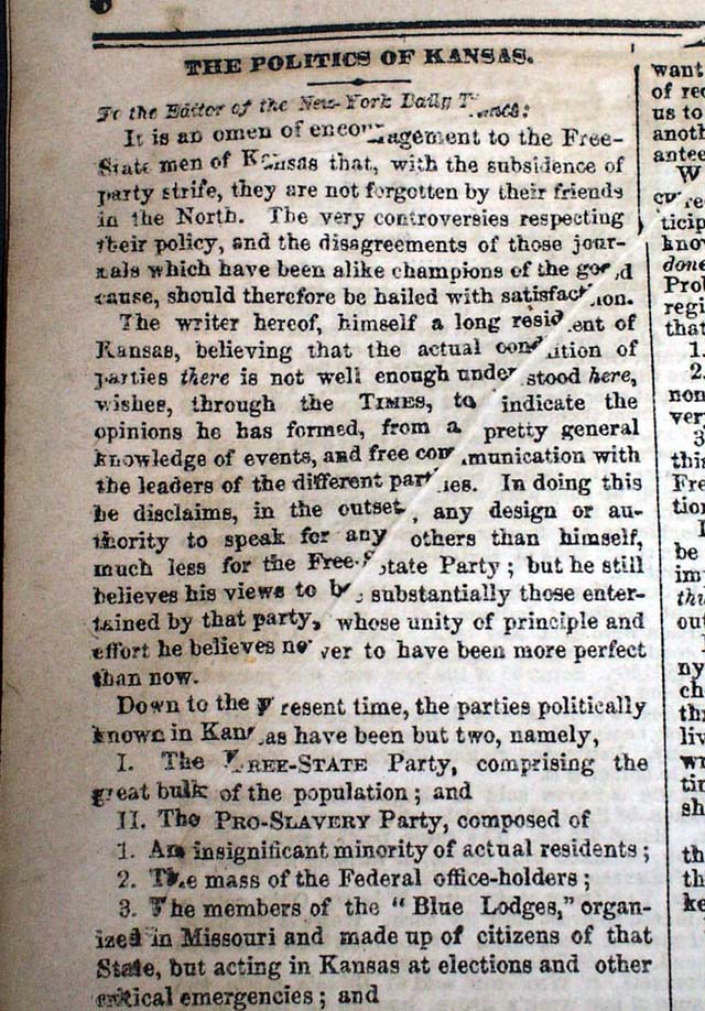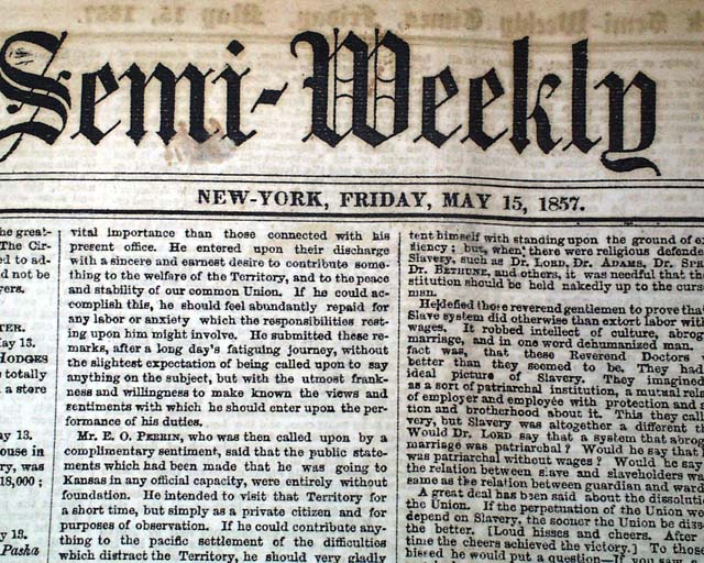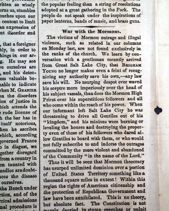 Other news of the day is found throughout, including a brief article about the ongoing conflict between the Mormons and the U.S. government, a few articles re: the Kansas situation (as it relates to slavery), and two with coverage related to the murder of Dr. Harvey Burdell.