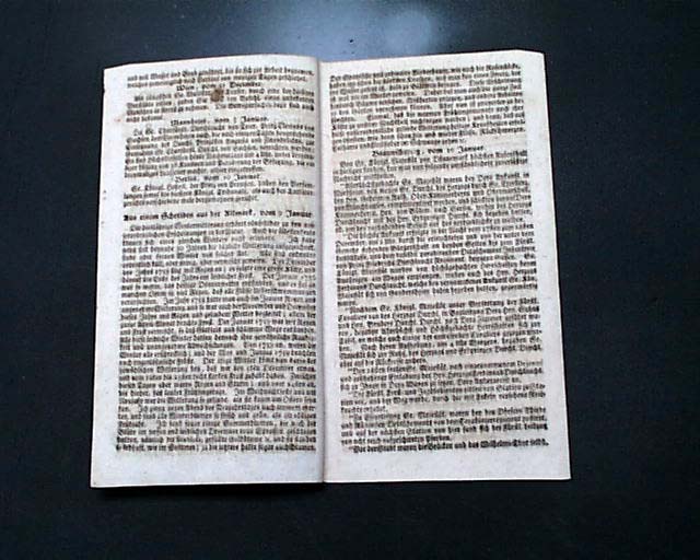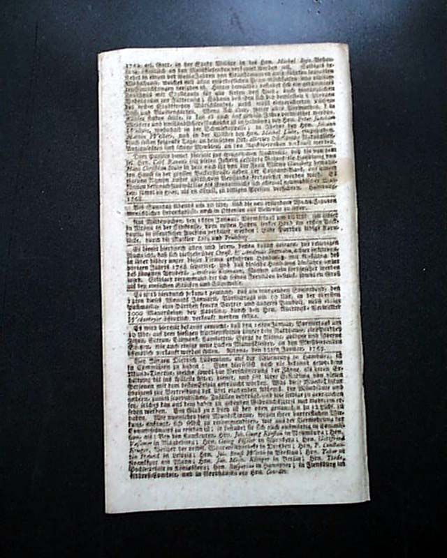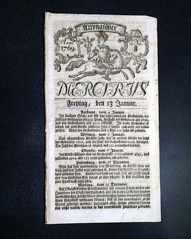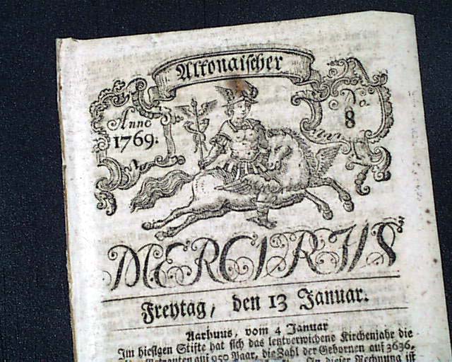 MERCURIUS [MERCURY], Hamburg, Germany, Jan. 13, 1769 This is a wonderful little newspaper with over one third of the front page of this German language newspaper is taken up with a very ornate & decorative masthead. The month & date are in the dateline: "12 January" and the year: "1769" is in the masthead surrounded by decorative embellishments, as is the issue number.