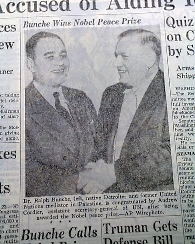* Ralph J. Bunche wins Nobel Peace Prize