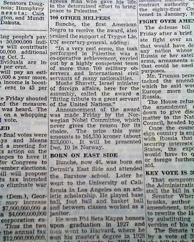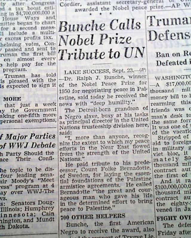 Page 3 has two column photo with heading: "Bunche Wins Nobel Peace Prize" And a one column heading reads: "Bunche Calls Nobel Prize Tribute to UN" (see images)