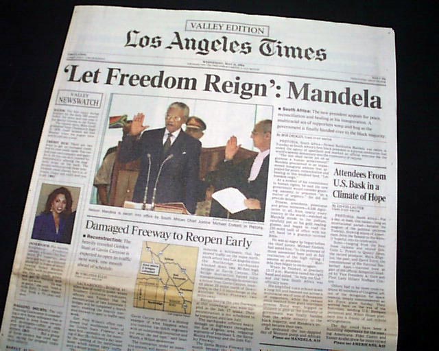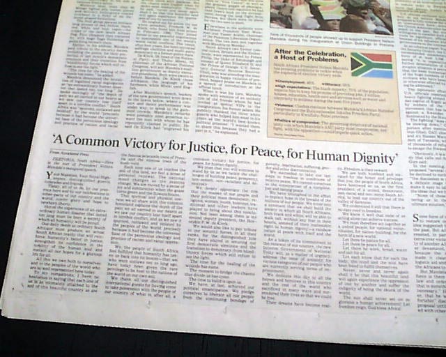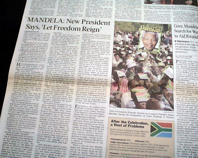 The front page has the banner headline: "'Let Freedom Reign': Mandela" with subhead and photo of Mandela taking the oath. Page 10 has additional coverage including the entire text of his inaugural speech and additional photos.