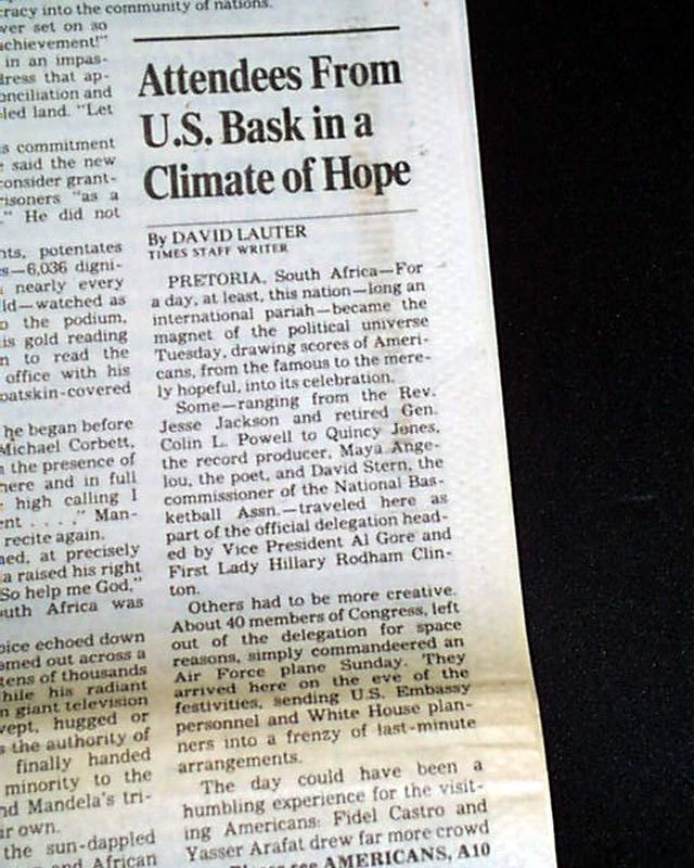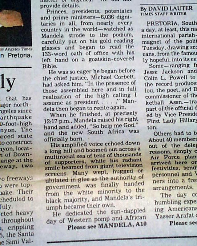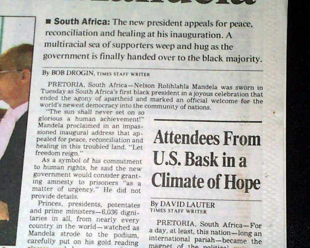 AI notes: On May 10, 1994, Nelson Mandela was inaugurated as South Africa’s first Black president in a historic ceremony at the Union Buildings in Pretoria, a moment that symbolized the formal end of apartheid and the birth of a democratic South Africa. Thousands of citizens gathered to witness the event, joined by numerous international dignitaries, including former U.S. President Jimmy Carter, representatives of the United Nations, and leaders from across Africa and the world. Mandela’s inauguration was marked by both solemnity and celebration, with traditional South African music, cultural performances, and patriotic displays reflecting the nation’s diversity. In his inaugural address, Mandela spoke passionately about reconciliation, nation-building, and the creation of a “Rainbow Nation” where all races could coexist in peace and equality, urging South Africans to forgive past injustices while working together for a unified future. The ceremony not only represented a political transformation but also became a global symbol of hope, demonstrating the triumph of justice, equality, and human dignity over decades of systemic oppression.