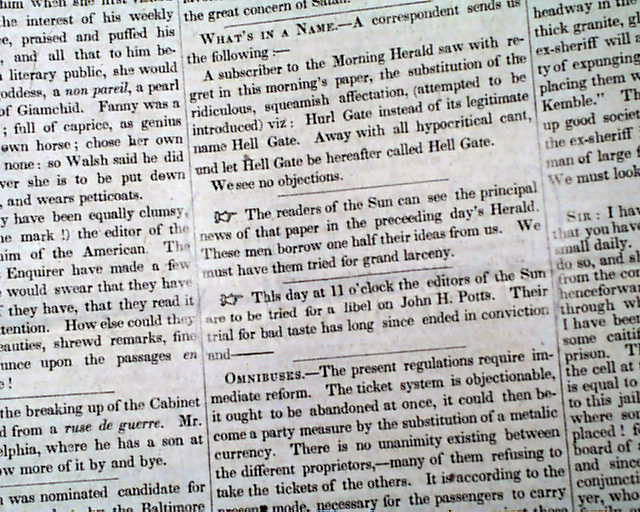 Page 2 has an interesting item: "The readers of the Sun can see the principal news of that paper in the preceeding day's Herald. These men borrow one half their ideas from us. We must have them tried for grand larceny."
