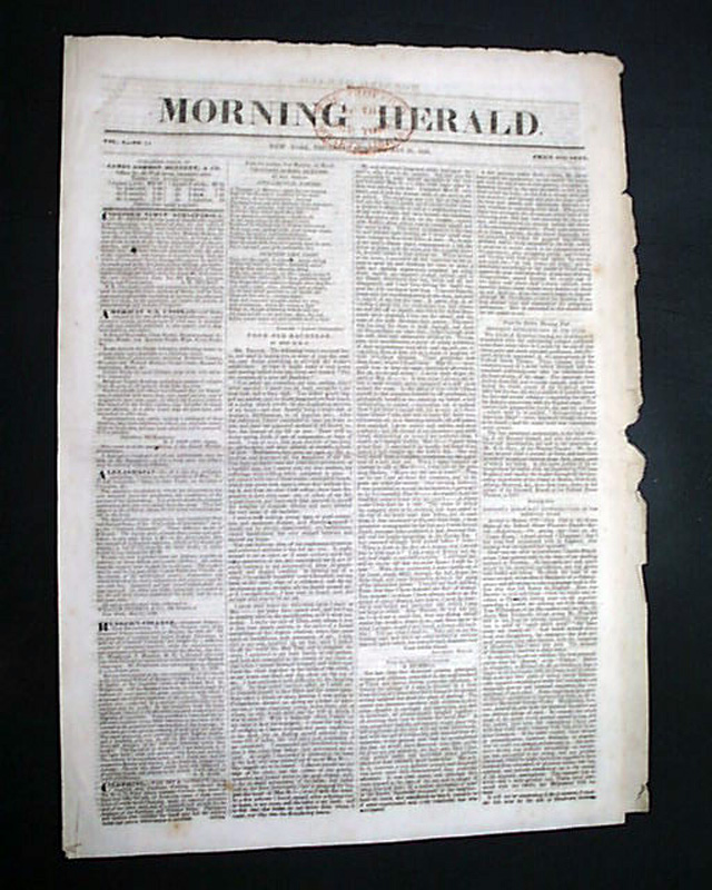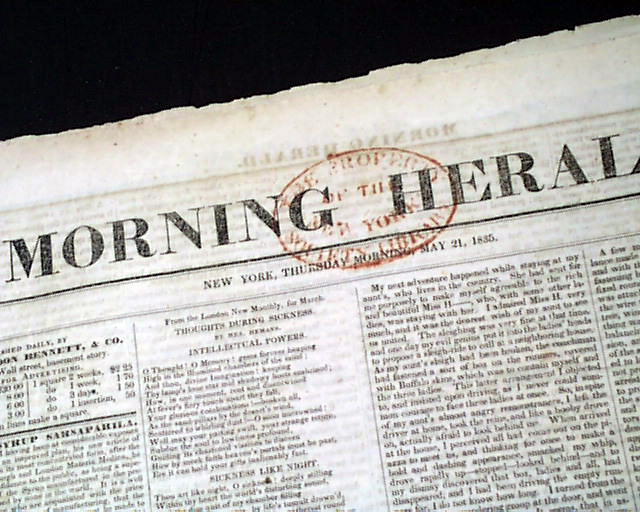 MORNING HERALD, New York, May 21, 1835 Although the title might seem common, this is a quite rare newspaper as it existed for the brief time of May 6 thru August 12, 1835 before being suspended, then coming back with a revised title for a lengthy publication run, ultimately merging with the N.Y. Tribune.