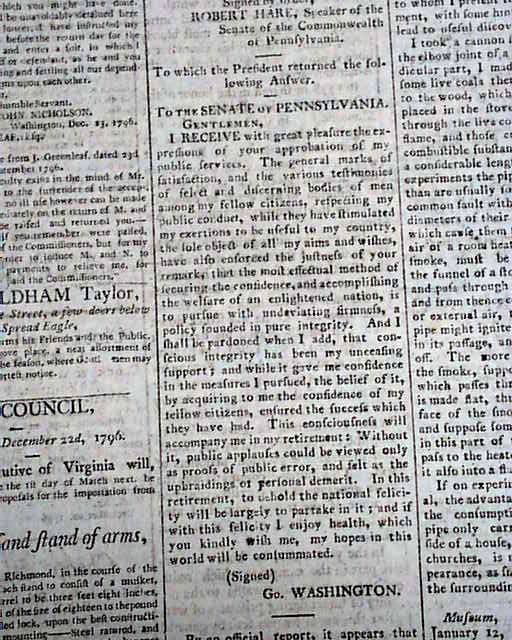 Page 2 features a letter to George Washington from the Penna. Senate, offering congratulations for his public service. It is followed by his grateful response, signed in type: Go. Washington.