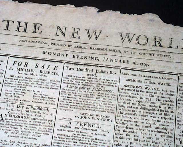 THE NEW WORLD, Philadelphia, Jan. 16, 1797  A scarce title, and until a recent find, the very first we have offered in our (soon to be) 50 years. It published for exactly one year.