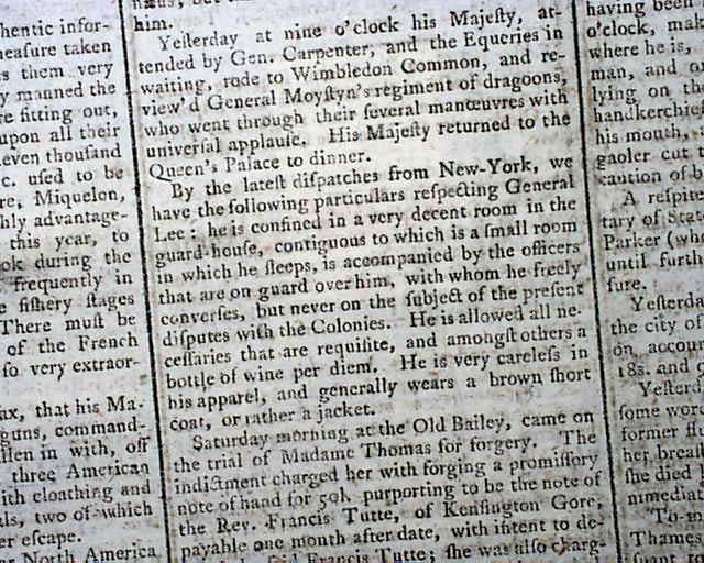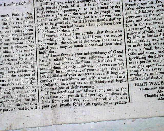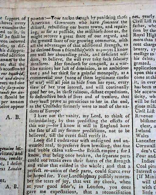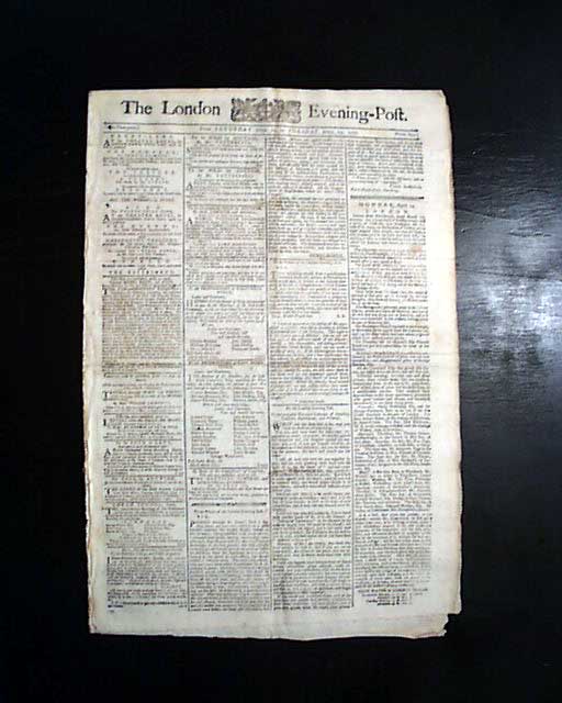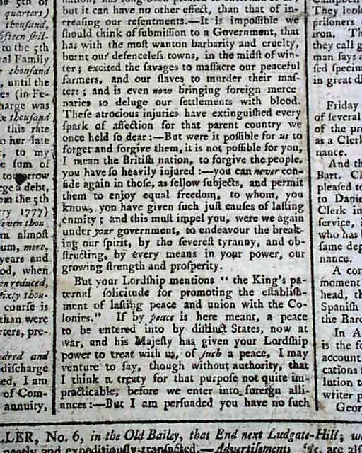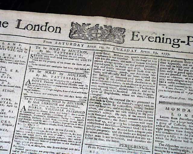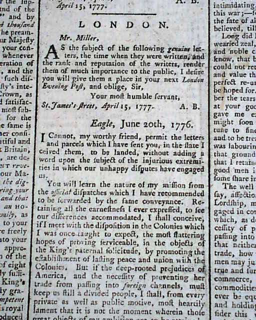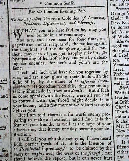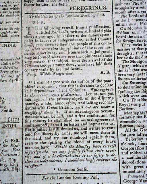 THE LONDON EVENING POST, England, April 15, 1777 The front page has a fascinating response to the famous "Common Sense" written by Thomas Paine, introduced with: "The following extract...written at Philadelphia...in answer to the famous pamphlet in favour of independence, called Common Sense...". The response begins: "I cannot agree with the author of the pamphlet...that this is the time to declare an independence of the Colonies...".