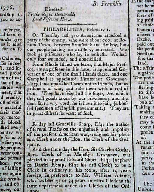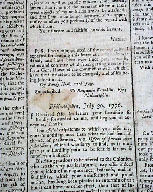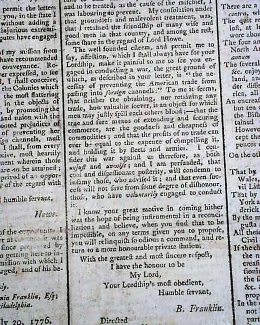 The most notable content could well be on the back page as it contains a letter from General Howe to Ben Franklin, signed in type: Howe, and dated June 20, 1776 in which he makes efforts to promote a peace between England and the colonies. This is followed by an uncommonly lengthy letter signed in type by: B. Franklin, taking one-quarter of the back page. Franklin states why a peace treaty will not work, and outlines the events of the war which make submission by the colonies impracticable.
