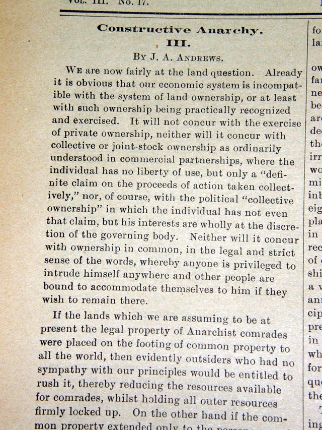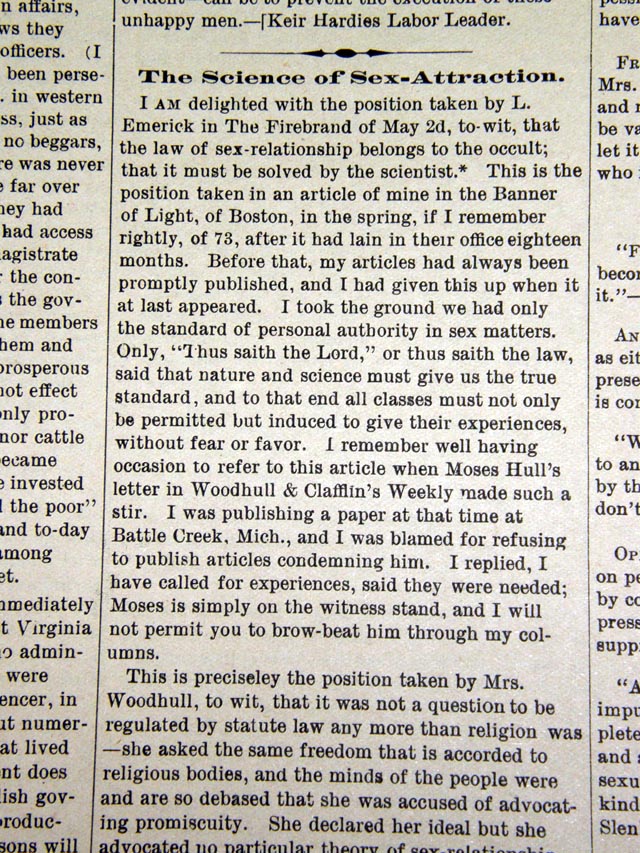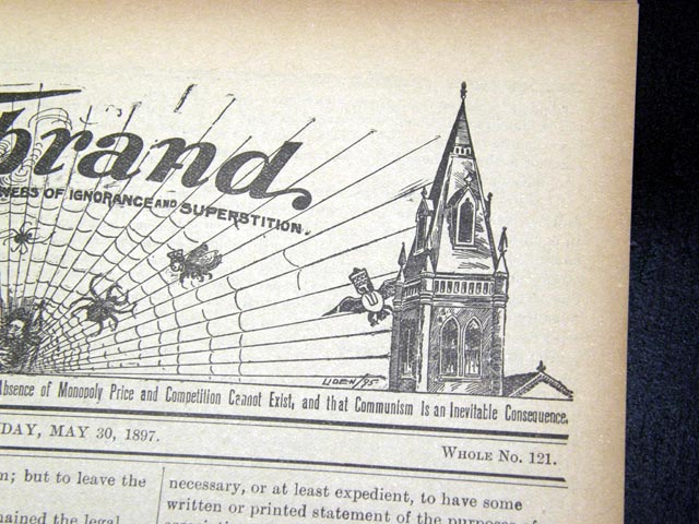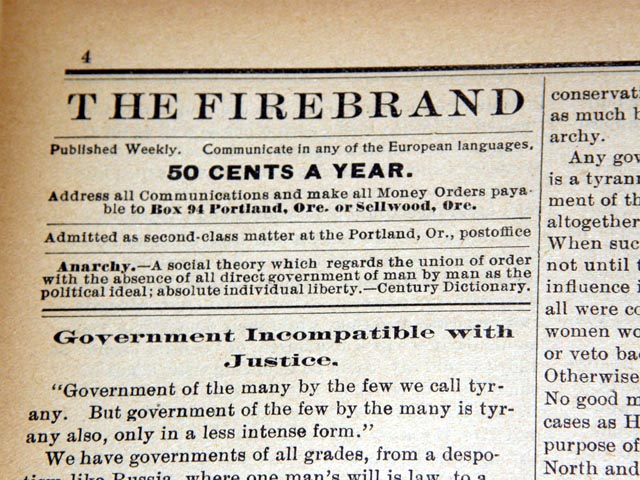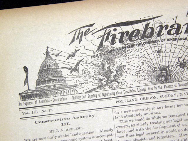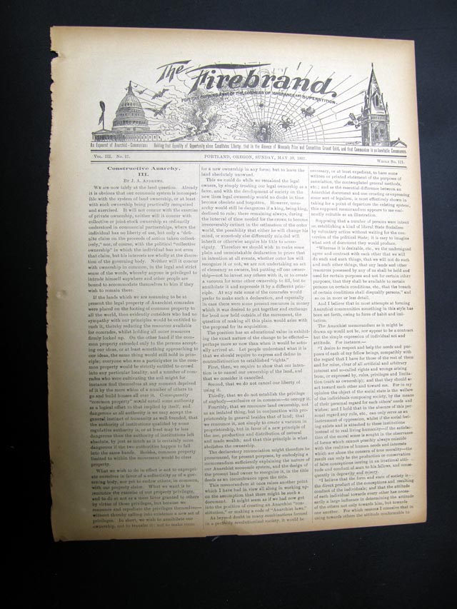 THE FIREBRAND, Portland, Oregon, May 30, 1897 A fascinating newspaper with their motto just under the title: "For the Burning Away of the Cobwebs of Ignorance and Superstition." and the dateline notes: "An Exponent of Anarchist - Communism. Holding that Equality of Opportunity alone Constitutes Liberty; that in the Absence of Monopoly Price and Competition Cannot Exist, and that Communism is an Inevitable Consequence."