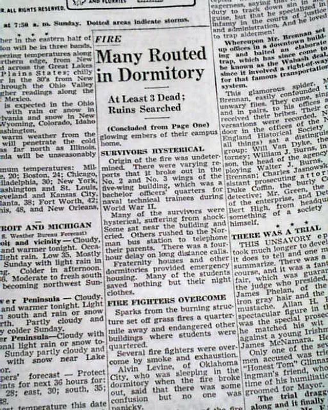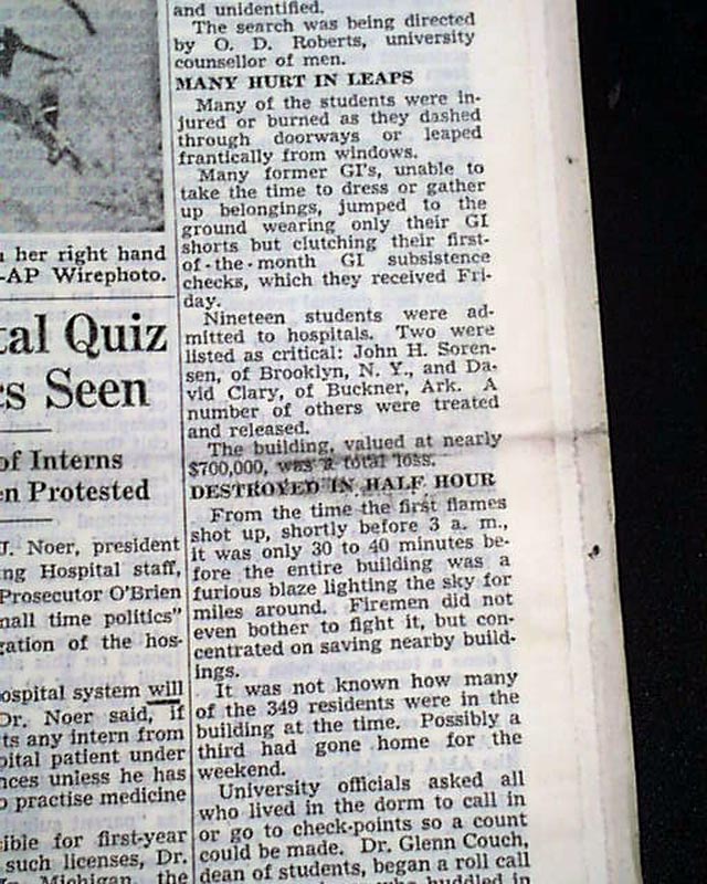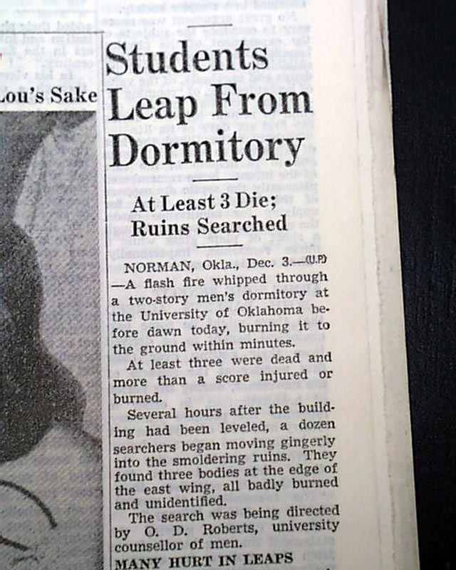 AI notes: On the early morning of December 3, 1949, a devastating fire erupted in the University of Oklahoma’s wooden Navy Barracks dormitory, a sprawling two-story building housing around 349 male students, many of whom were veterans attending school under the G.I. Bill. The fire started around 1:30 a.m. in the No. 1 wing of the dormitory, quickly spreading through the highly flammable wooden structure, engulfing it in flames within minutes. Students were abruptly awakened by the chaos, and the intense heat and thick smoke made escaping extremely difficult. Many had to break windows or jump from upper floors to flee the inferno, resulting in injuries. Despite desperate rescue efforts, the fire claimed the lives of three students and injured 21 others. The entire building was destroyed, leaving only concrete supports standing. The tragedy underscored the dangers posed by outdated wooden dormitories and prompted the University to improve fire safety measures and emergency responses in subsequent years.