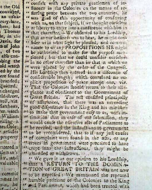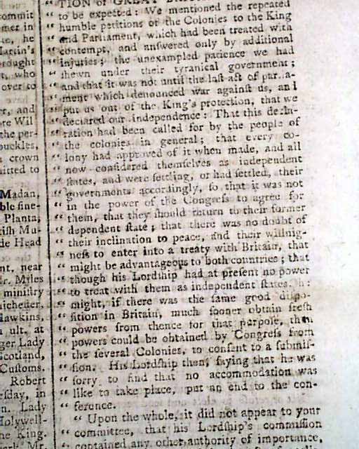 The key statements in the report: "...contained no explicit proposition of peace except one, that the Colonies should return to their allegiance and obedience to the government of Great Britain. The rest consisted principally of assurances...We gave it as our opinion to his Lordship, that a RETURN TO THE DOMINATION OF GREAT BRITAIN was not now to be expected...". A very significant report.