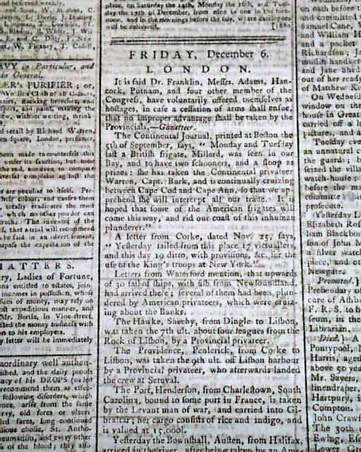 THE LONDON EVENING POST, England, Dec. 7, 1776 The ftpg. news begins with an interesting item: "It is said Dr. Franklin, Messrs. Adams, Hancock, Putnam, and four other members of the Congress, have voluntarily offered themselves as hostages in case a cessation of arms shall ensue, that no improper advantage shall be taken by the Provincials." Some additional items concerning America.
