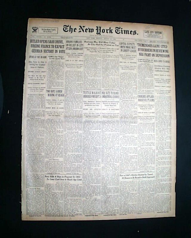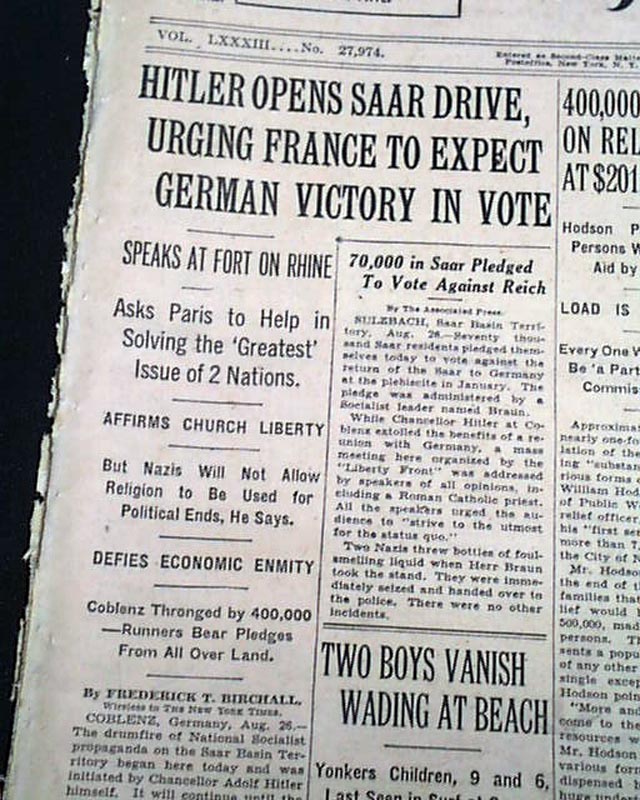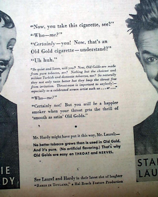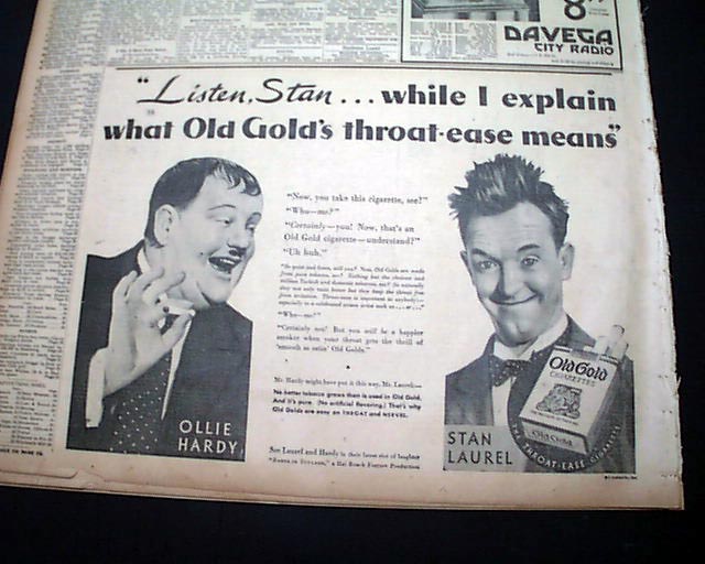 Other news of the day throughout with much on Adolph Hitler near the beginning of his grip on Germany. Also a interesting advertisement on the back page with Laurel and Hardy for 'Old Gold Cigarettes". (see)