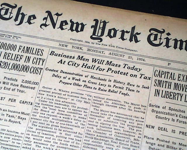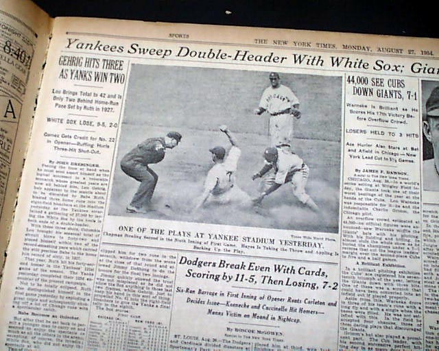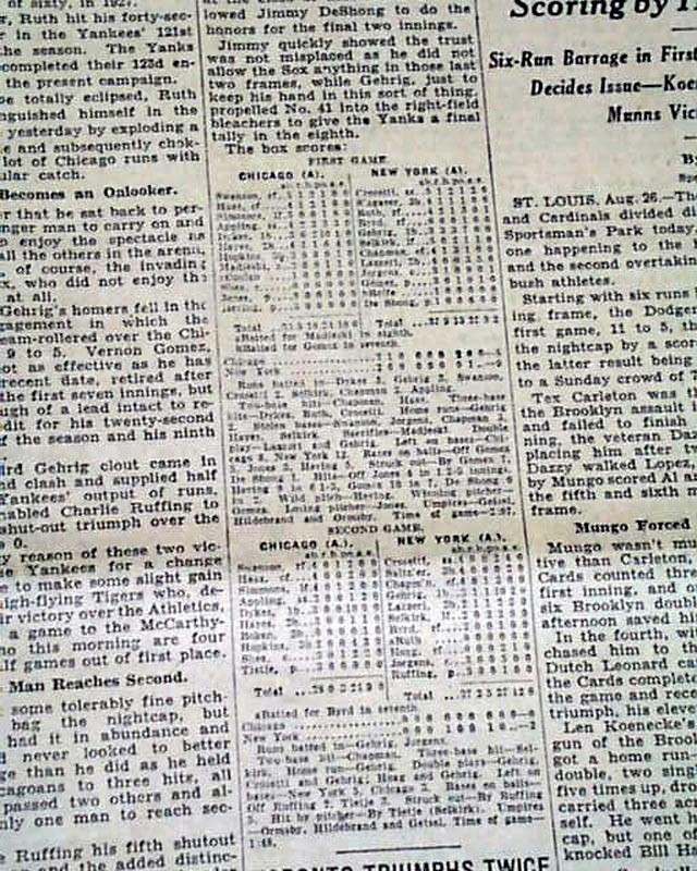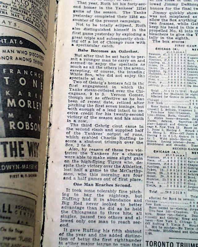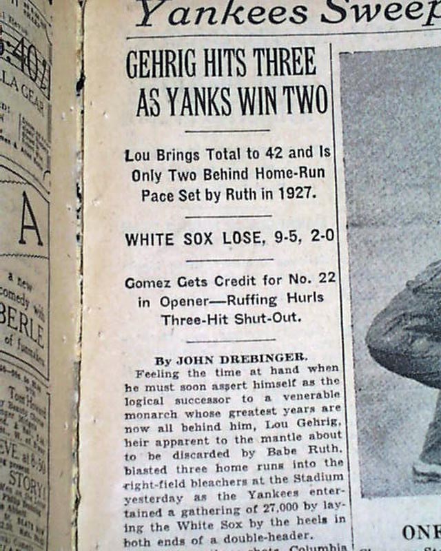The sport's section (page 19) has a five column headline: "Yankees Sweep Double-Header With White Sox" with subheads that include: "GEHRIG HITS THREE AS YANKS WIN TWO" and more. (see)