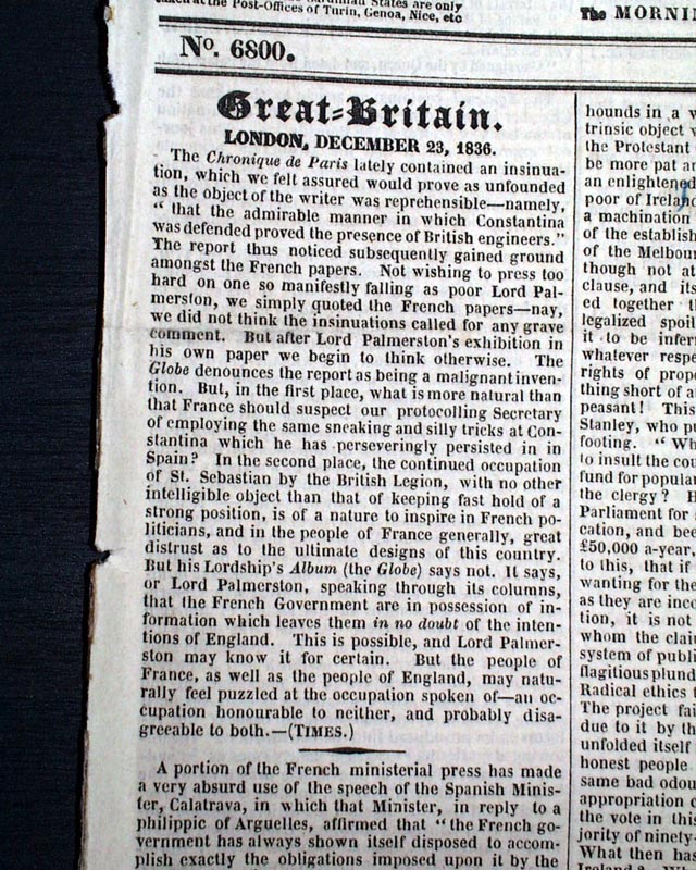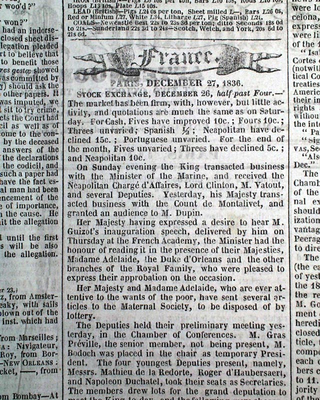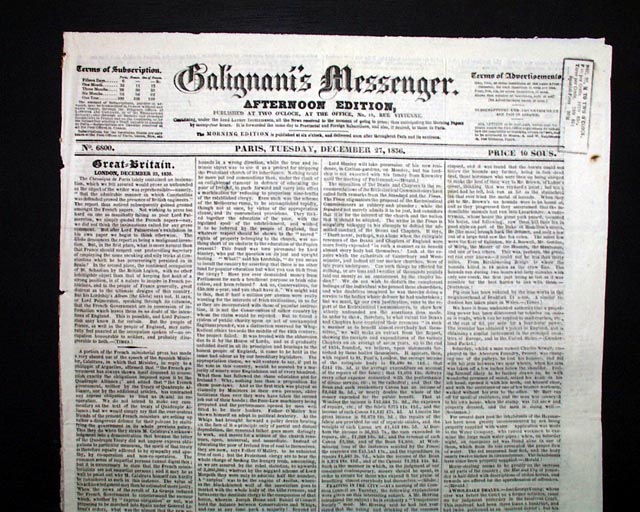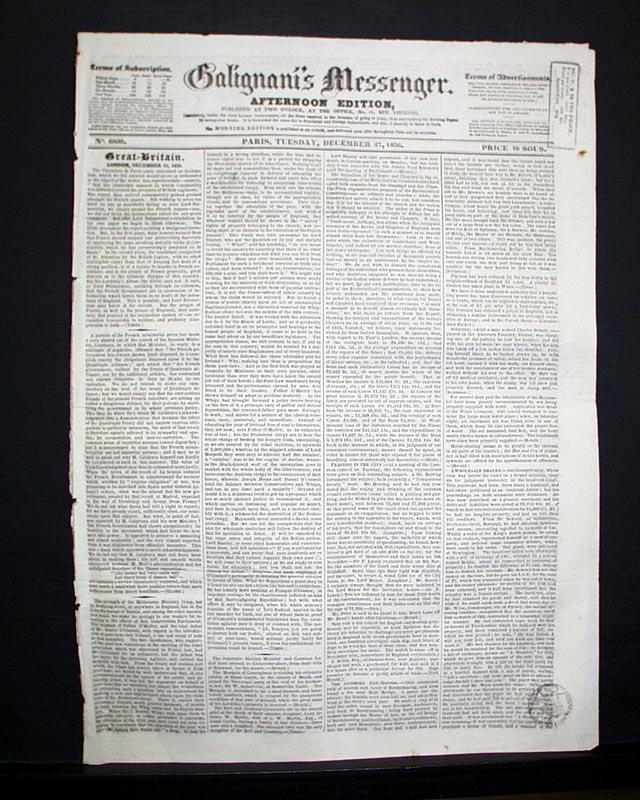 GALIGNANI'S MESSENGER, Paris, Dec. 27, 1836 An interesting newspaper from Paris, France but printed in English, and featuring a black-inked tax stamp on the front page. Various news of advertisements. The policy/purpose of this title was to promote good feeling between England and France, and was highly regarded. It was viewed to be progressive.
