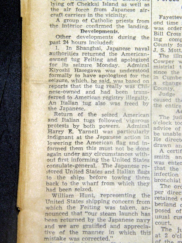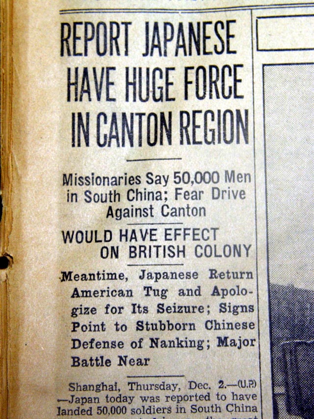 The top of the front page has a one column heading: "REPORT JAPANESE HAVE HUGE FORCE IN CANTON REGION" with subheads. (see images)