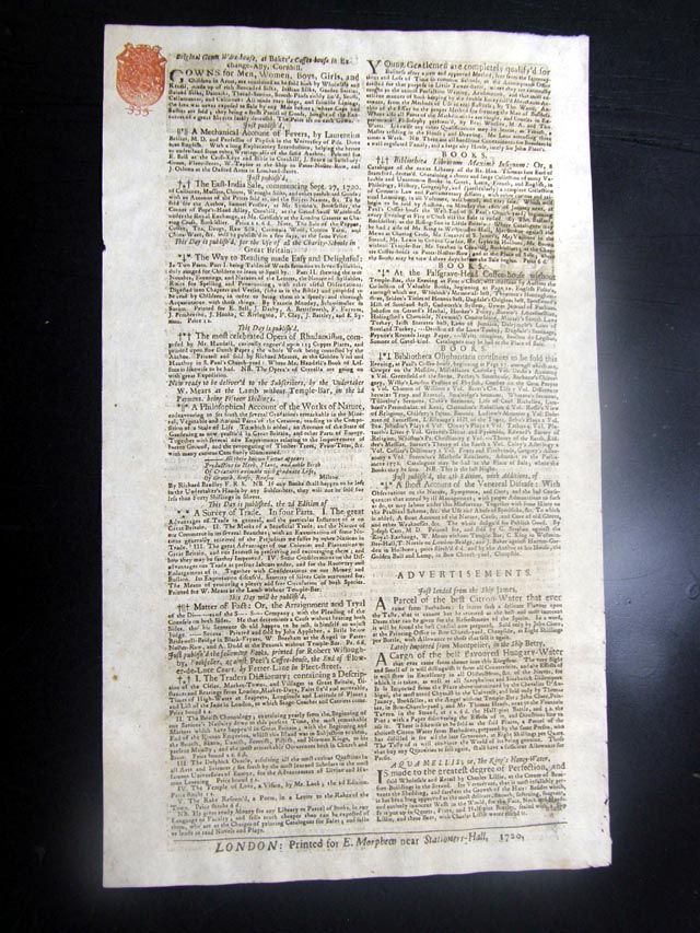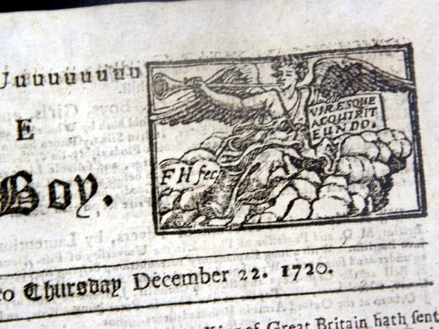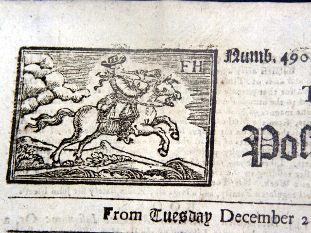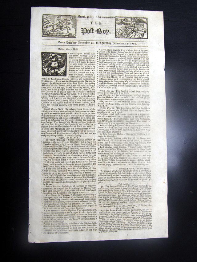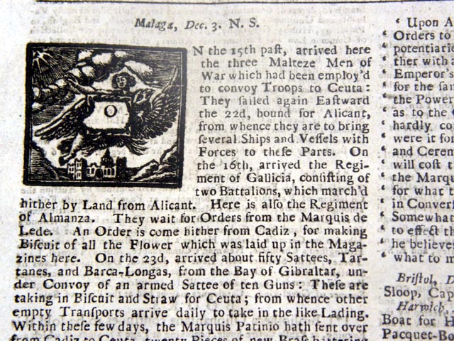 One of my favorite 18th century newspapers with the two nice engravings in the masthead, plus the very decorative first letter in the text (see). Various European reports.