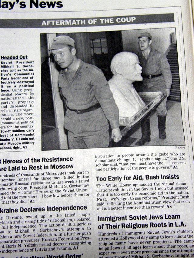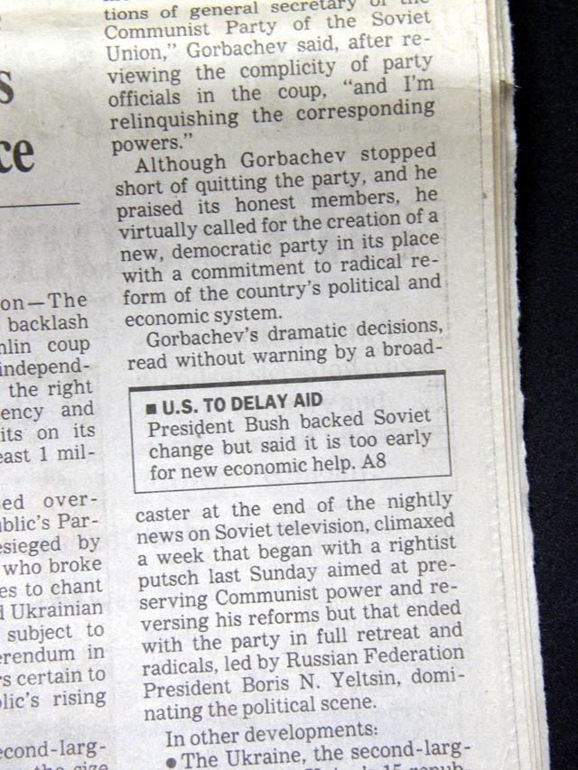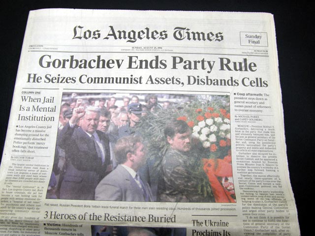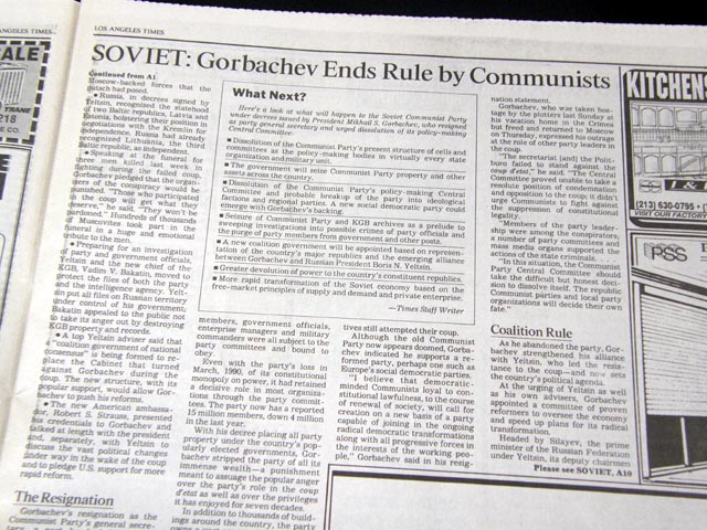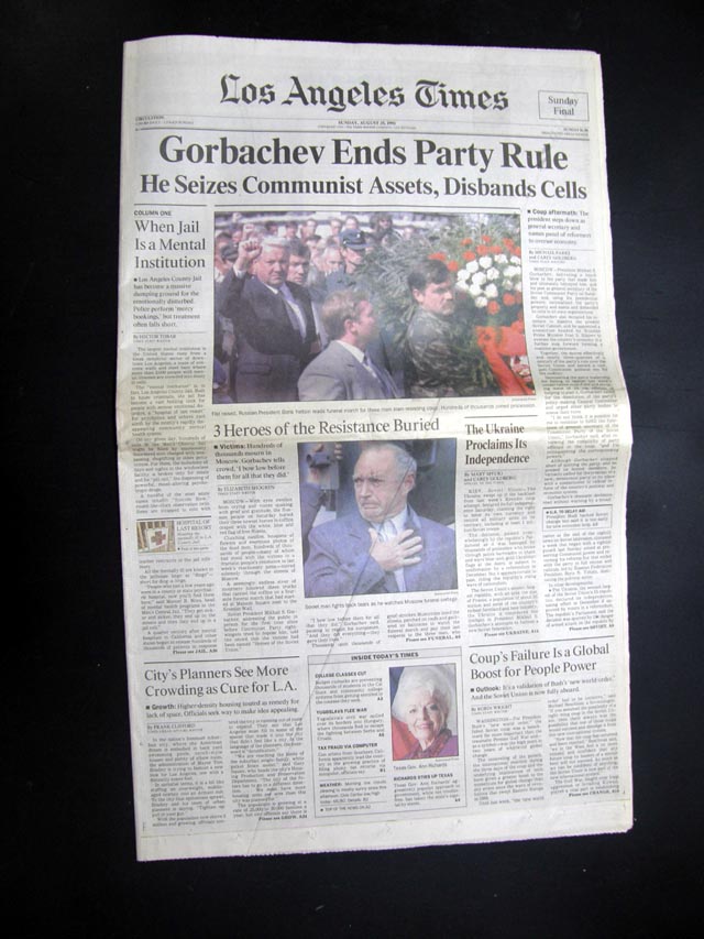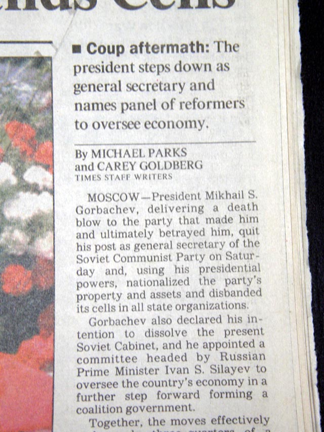The front page has a banner headline: "Gorbachev Ends Party Rule; He Seizes Communist Assets, Disbands Cells" with subheads and two related photos. (see images)
