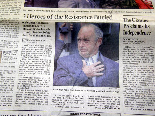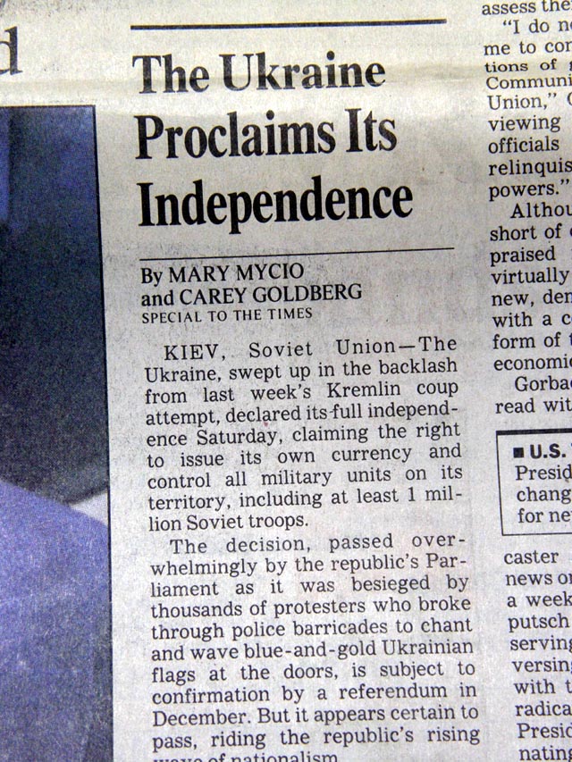 AI notes: By late August 1991, both Russia and Ukraine were moving decisively away from Soviet authority in the wake of the failed coup in Moscow (August 19–21). In Russia, President Boris Yeltsin and the Russian Supreme Soviet asserted sovereignty over Russian territory, effectively sidelining Mikhail Gorbachev and the central Soviet government, and laying the groundwork for Russia’s emergence as an independent state. Simultaneously, Ukraine had declared independence on August 24, 1991, with the declaration gaining international attention by August 25. The Ukrainian parliament moved quickly to establish full control over its government and institutions, signaling a definitive break from Moscow, while later confirming the move through a nationwide referendum on December 1, in which more than 90% of voters supported independence. These parallel actions by Russia and Ukraine marked a decisive turning point in the disintegration of the Soviet Union, demonstrating that major republics were no longer willing to remain under centralized Soviet control and accelerating the collapse that would culminate in December 1991.