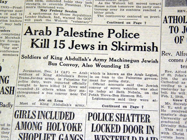 AI notes: On December 14, 1947, a Jewish convoy was ambushed near Lod (Lydda), Palestine, during the escalating violence following the UN Partition Plan for Palestine (adopted on November 29, 1947). The attack occurred during the early stages of the 1947–1948 Civil War in Mandatory Palestine, when Arab and Jewish communities began engaging in open hostilities. The convoy was attempting to transport supplies and possibly people between Jewish settlements, when it was ambushed by Arab irregulars. According to contemporary reports and later historical accounts, several Jews were killed or wounded, and the incident intensified retaliatory attacks and hardened both sides' resolve as violence spread across the region. This period was marked by increasing attacks on roads, ambushes, and sieges, especially targeting Jewish convoys trying to reach isolated settlements. The December 14 attack is one that lead-up to the 1948 Arab-Israeli War.