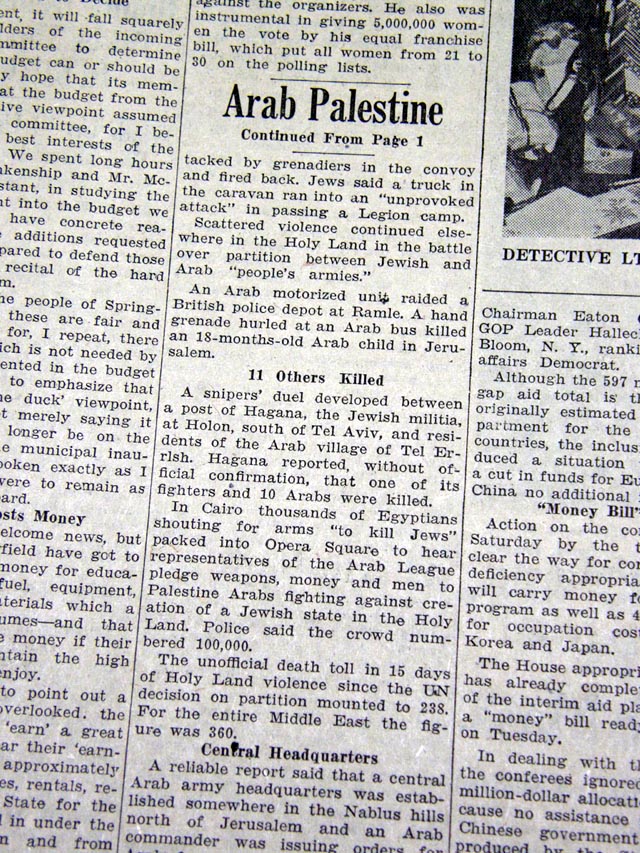 The front page has a two column heading: "Arab Palestine Police Kill 15 Jews in Skirmish" with subhead. (see images)