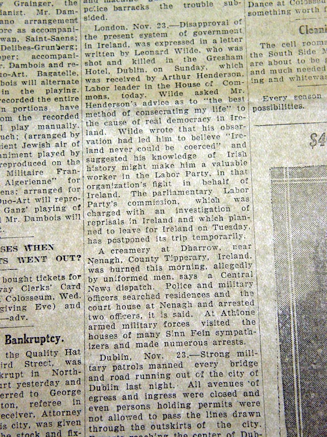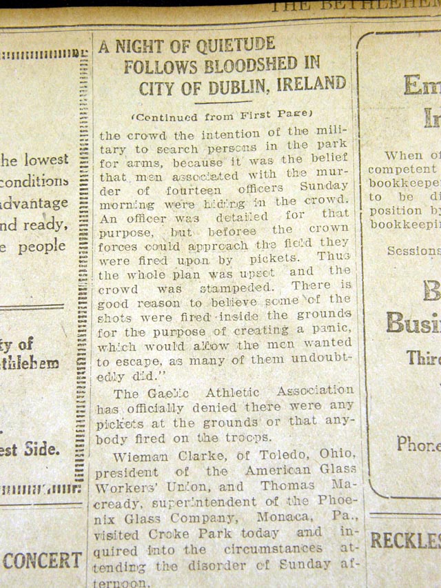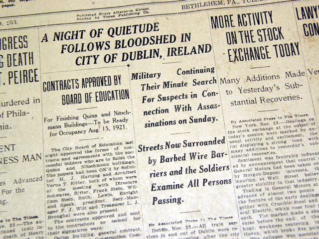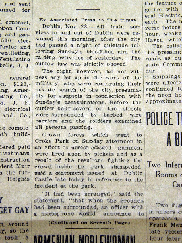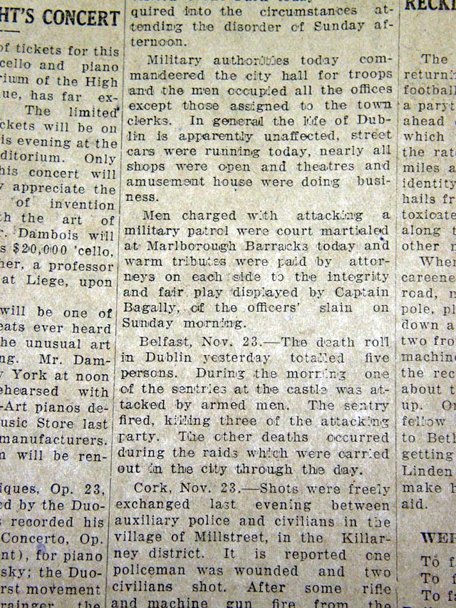 The top of the front page has a two column heading: "A NIGHT OF QUIETUDE FOLLOWS BLOODSHED IN CITY OF DUBLIN, IRELAND" with subheads. (see images)