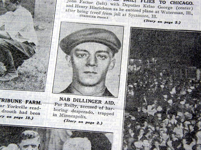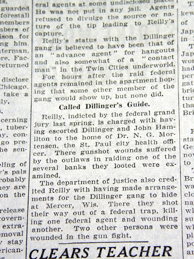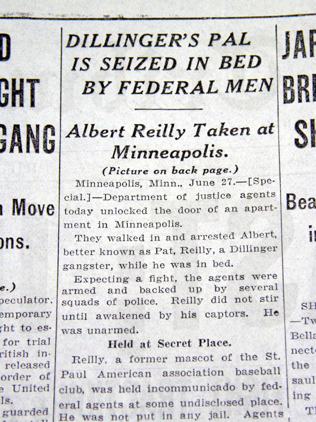 The top of page 2 has a one column heading: "Dillinger's Pal Is Seized In Bed By Federal Men" with subhead. Small photo of Reilly is on the back page. (see images) Nice to have in this Chicago publication, the city where he would eventually be shot dead less than a month later.