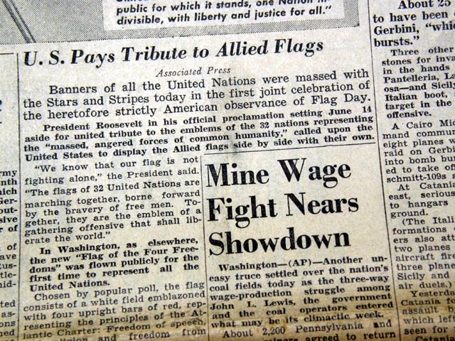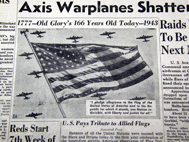 The front page has a three column photo with heading: "1777--Old Glory's 166 Years Old Today--1943", which includes the full text of the "Pledge of Allegiance"