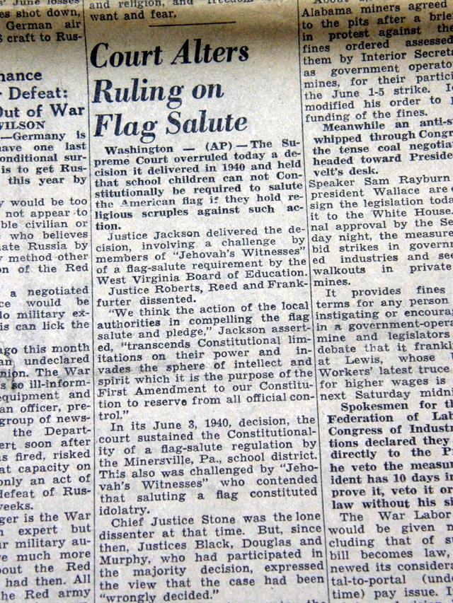 But the most important report has a one column heading: "Court Alters Ruling on Flag Salute" (see images)